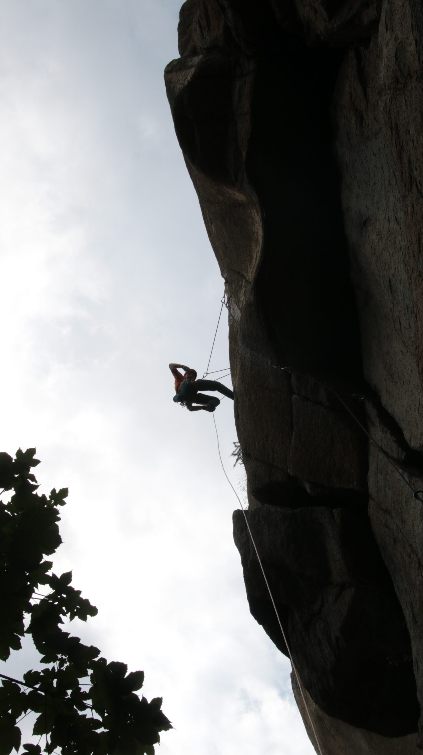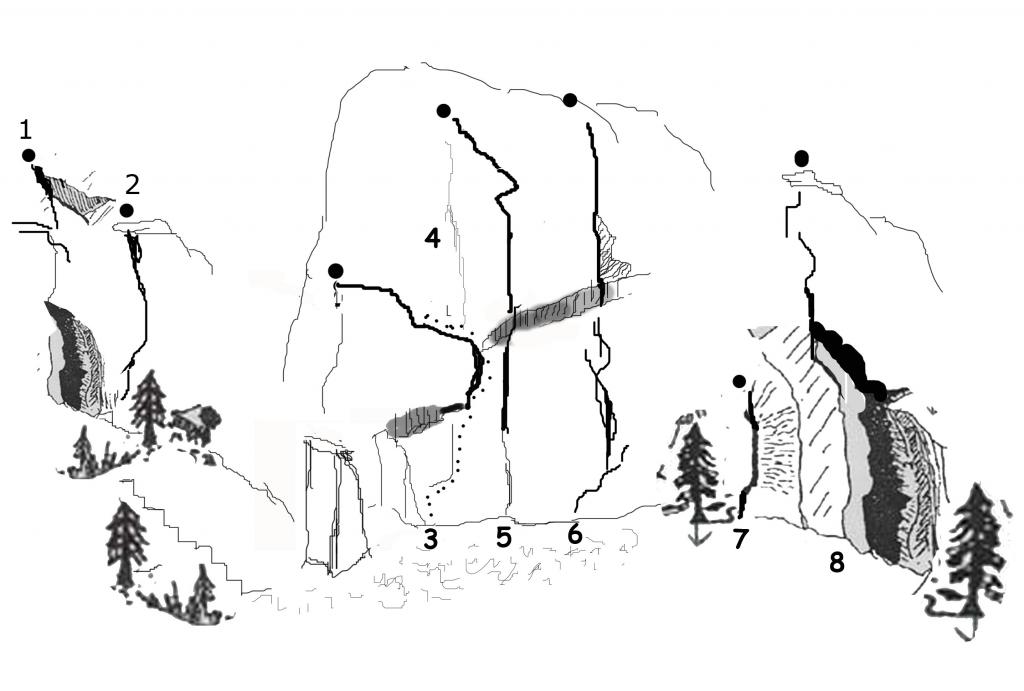 Bella ed unica nel suo genere inizia con difficili boulder protetti da chiodi, poi spettacolare traverso su fessura larga ed esposta.