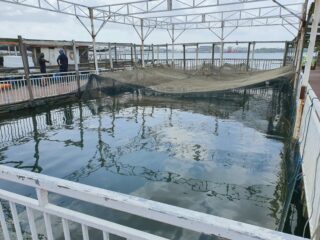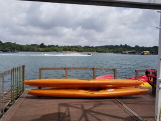 Dapprima ci siamo diretti verso Changi Beach su itinerario gia’ percorso. Stavolta, pero’, fortunatamente, il tempo era bello e stabile. Quando siamo arrivati alla fine di Pasir Ris Park, abbiamo notato numerosi kayak turistici diretti alla volta del ristorante. Si trattava di una escursione guidata. Cosi’ ci siamo accodati al gruppo e abbiamo attraversato in sicurezza lo Stretto di Johor. Siamo arrivati al ristorante battendo sul tempo il gruppo di amatori grazie ai nostri kayak da spedizione e abbiamo subito ordinato il pranzo. Dopodiche’, ho pescato il pesce per il pranzo, un grande lutiano rosso.