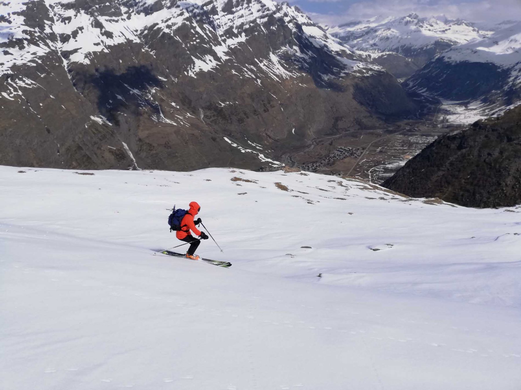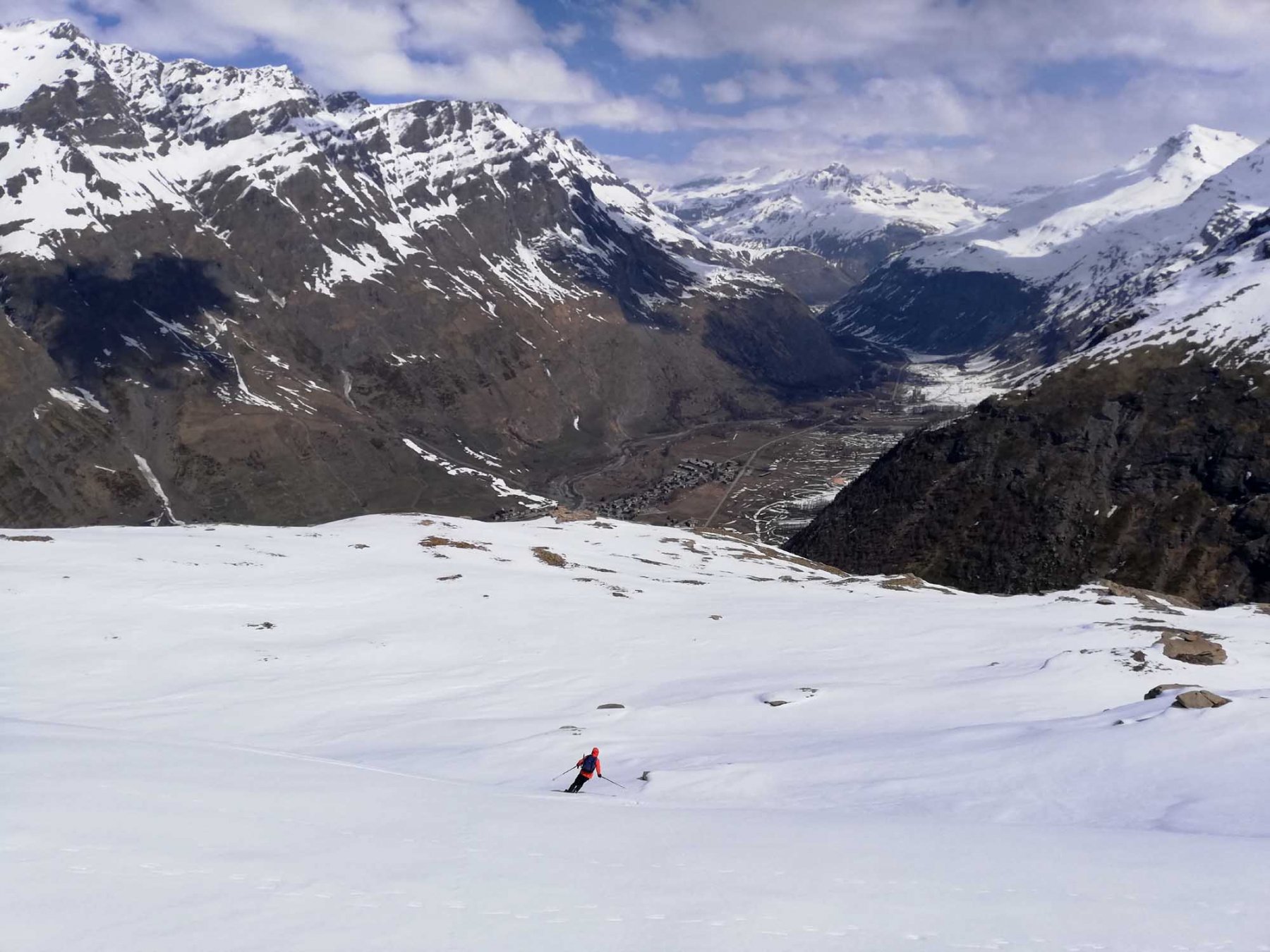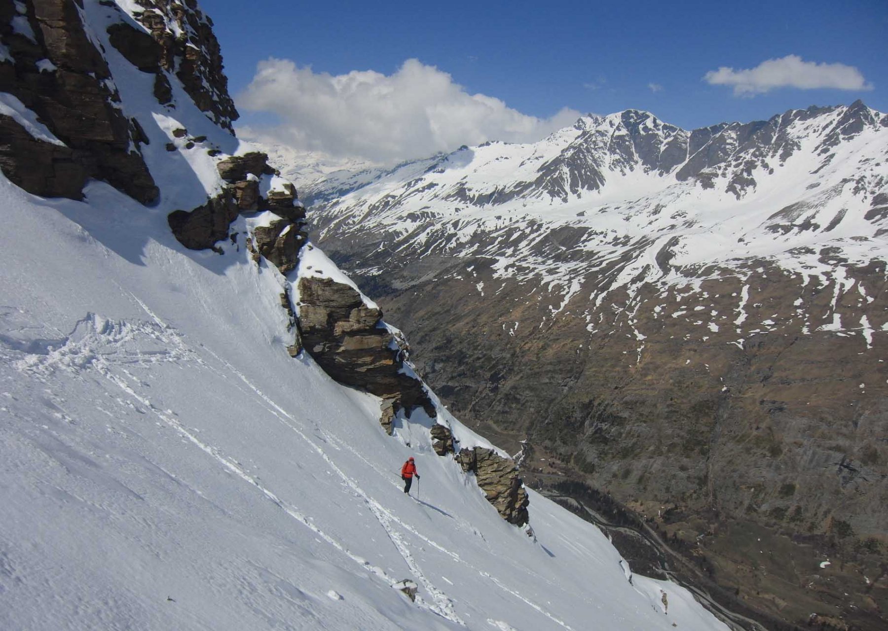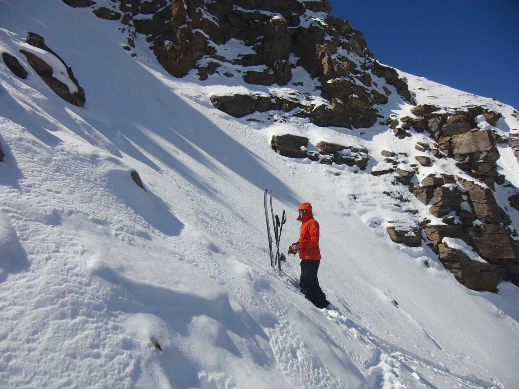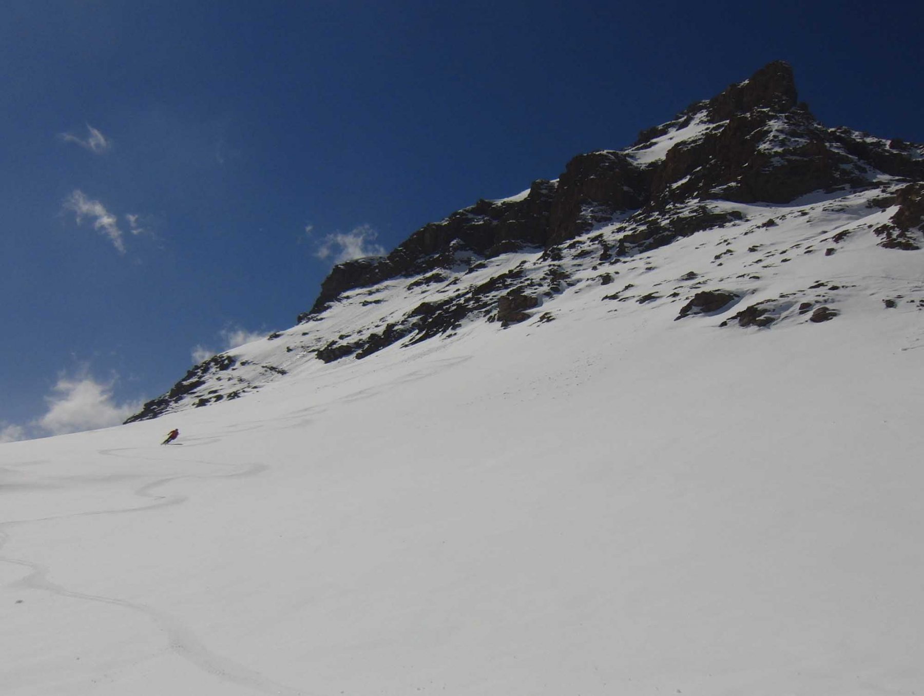 Per gli sciatori molto sicuri, è possibile scendere il pendio sospeso dalla base del muro finale al canalino.