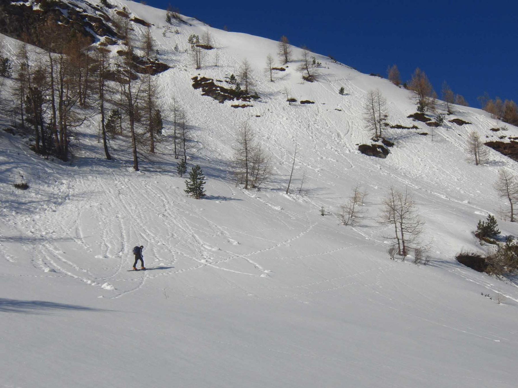 Al di sotto seguire l’itinerario di salita fino al Lac du Soliet, poi scendere direttamente sui bei pendii della dorsale nord nell’aperto lariceto, fino all’imbocco del sentiero dalla strada nei pressi del ponte di partenza.