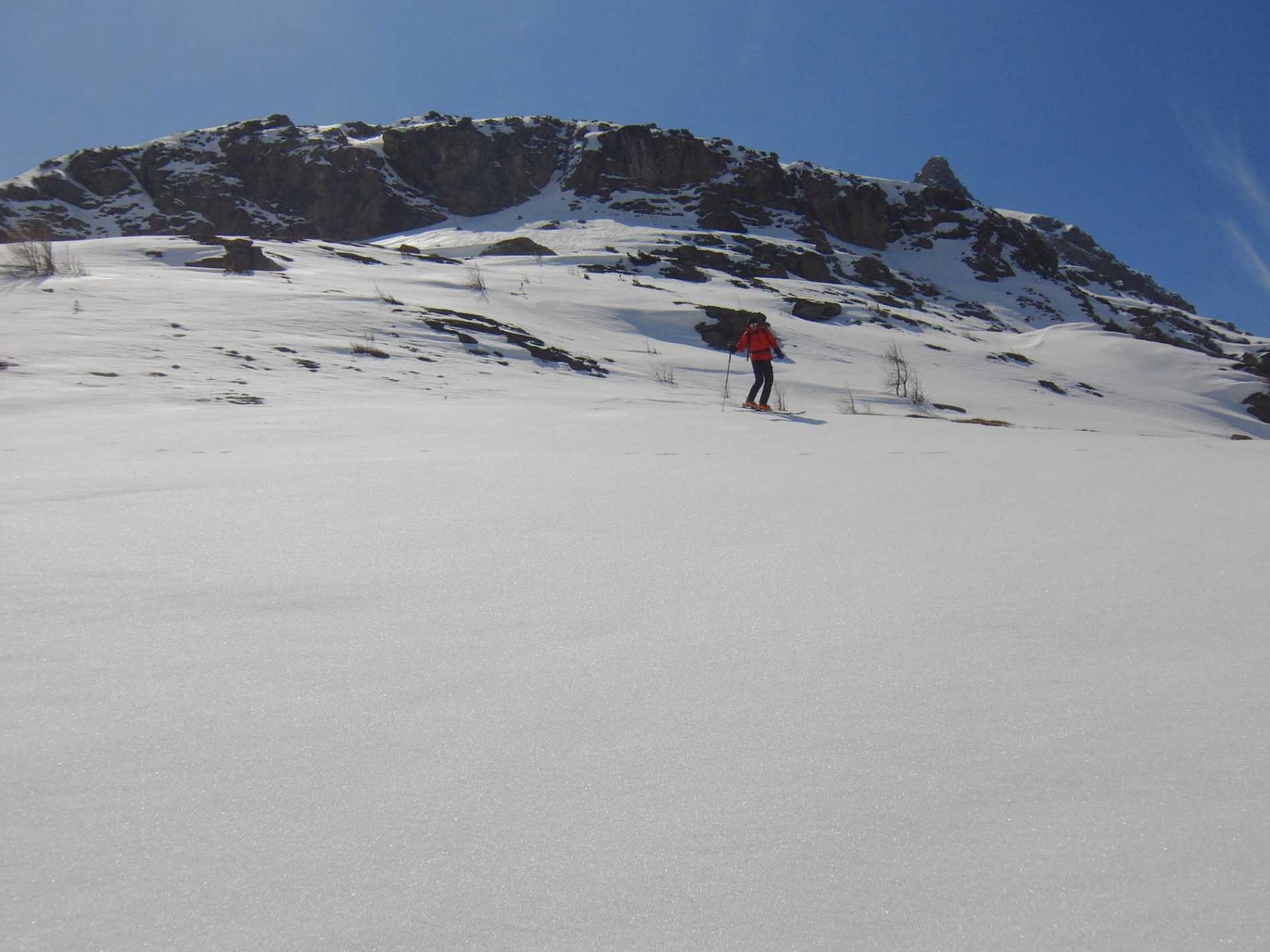 Imboccare il sentiero per il Lac de Soliet con all’inizio le due gradonate in pietra; se è tutto ben innevato, dopo le scalette si può proseguire sci ai piedi sempre seguendo il sentiero; al bivio con il GR Tour Maurienne prendere a sinistra, passare al Plan du Lau e raggiungere il ripiano del Lac du Soliet. Proseguire sui pendii a destra e portarsi al di sopra della Feiche Galleise (l’ultimo pendio di uscita molto ripido è consigliabile salirlo con i ramponi) e continuare sui pendii più dolci stando a sinistra dei Rochers de la Plate; attraversare gradualmente a sinistra per poi risalire una ripida dorsale in un unico punto più agevole (un tratto con ramponi di nuovo consigliabili) e giungere sui dolci pendii della Plate de Ste Anne lungo i quali, stando a sinistra della dorsalina, portarsi alla base dei pendii-conoide sotto la fascia rocciosa che separa dai pendii finali. Quasi verso l’uscita dei pendii-conoide aggirare sulla destra la dorsale e salire fino ad un evidente stretto e ripido canalino tra le rocce, orientato da destra a sinistra, alla base del quale (quota 2.780) è consigliabile lasciare gli sci.
