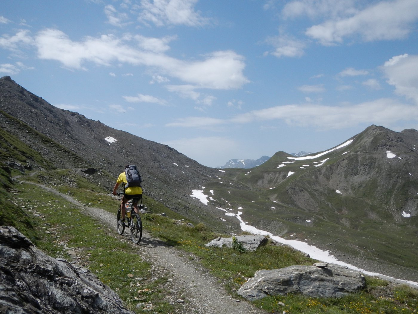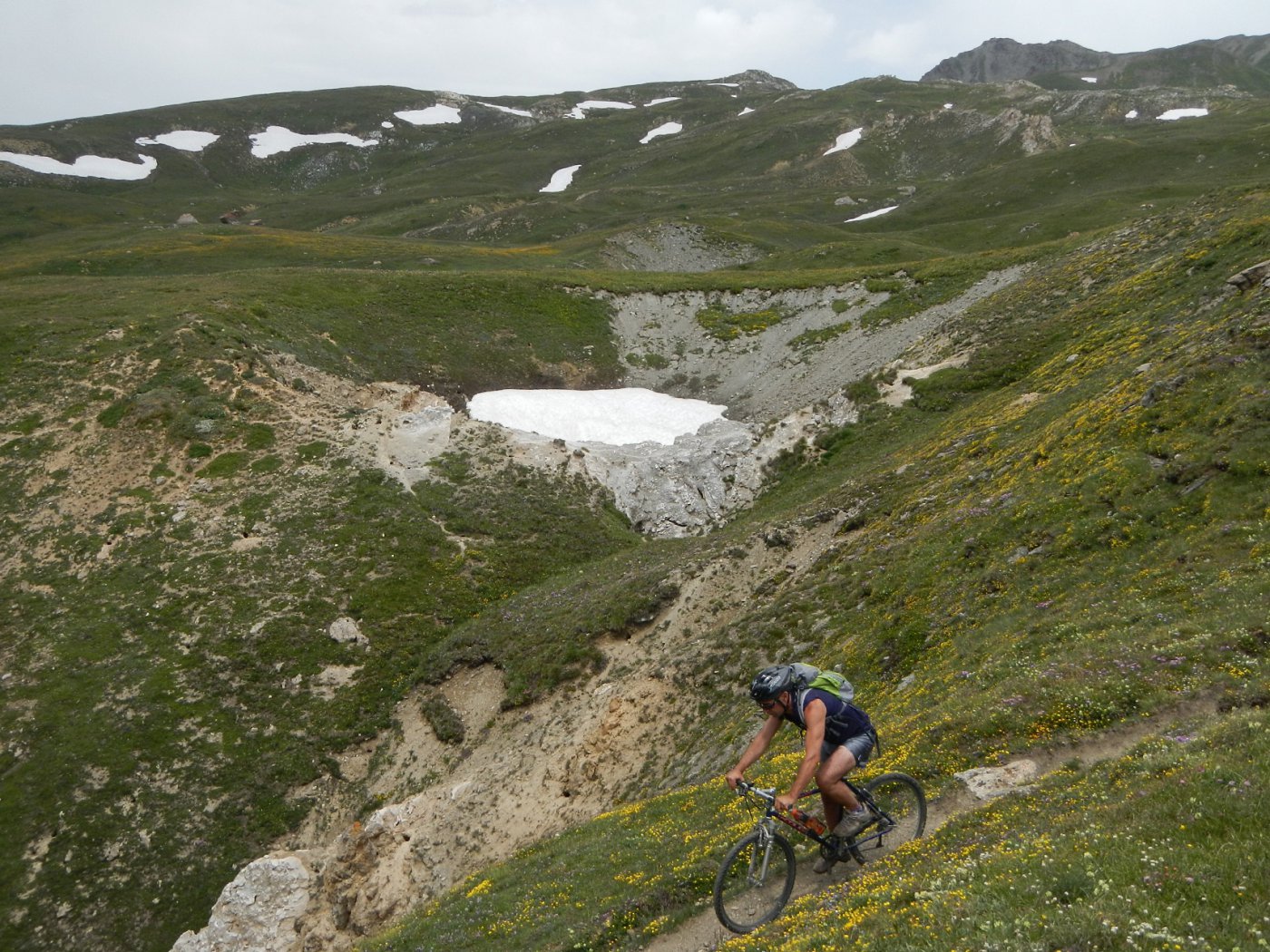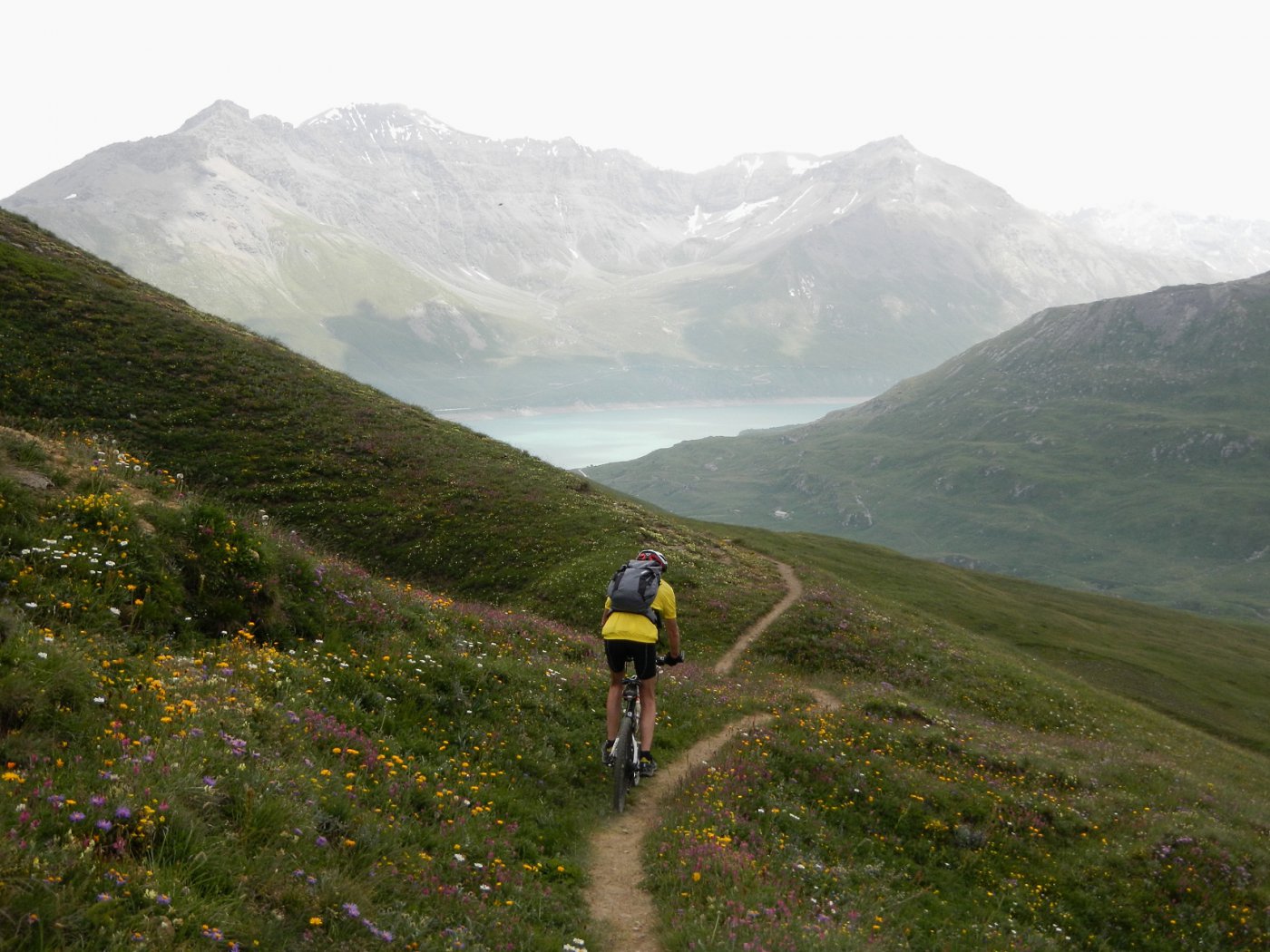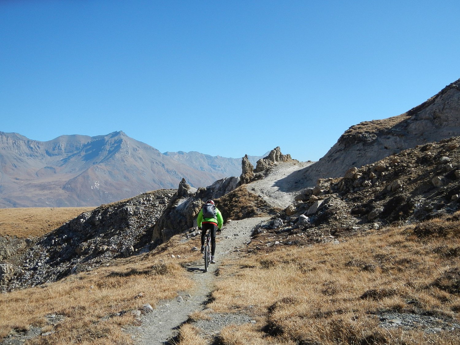Dal colle seguire le indicazioni per il Col du Petit Mont Cenis con una bellissima discesa su un sentiero in mezzo ai prati fino a raggiungere la strada asfaltata che con qualche saliscendi riporta al Colle del Moncenisio (30 km). Da qui scendere per circa 500 m lungo la statale e all’altezza di una bergeria svoltare a sx e seguire lo Chemin de la Ramasse (all’inizio poco evidente) che con una divertente discesa lungo le piste da sci riporta in breve a Lanslebourg (34 km)