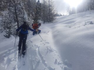 La discesa, purtroppo, complice gli sci non sufficientemente larghi, è risultata faticosa; anche sulle massime pendenze gli sci sprofondavano; magari con sci più larghi qualche bella curva in alto e nel bosco si sarebbe potuta anche fare.
