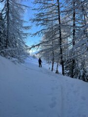 Nel primo tratto di discesa siamo stati a dx trovando belle zone di bosco intonso, poi pista praticamente battuta dai vari passaggi.