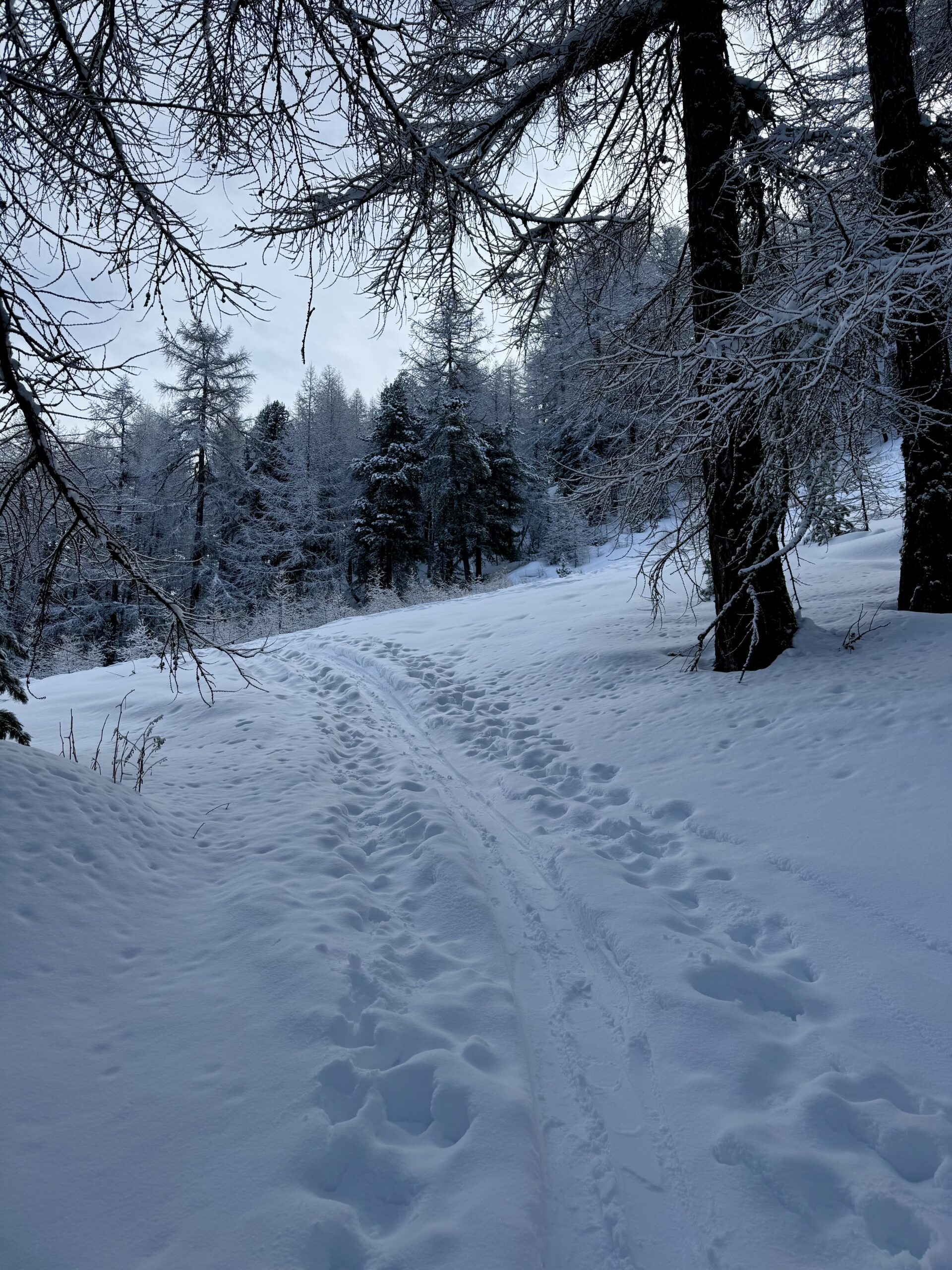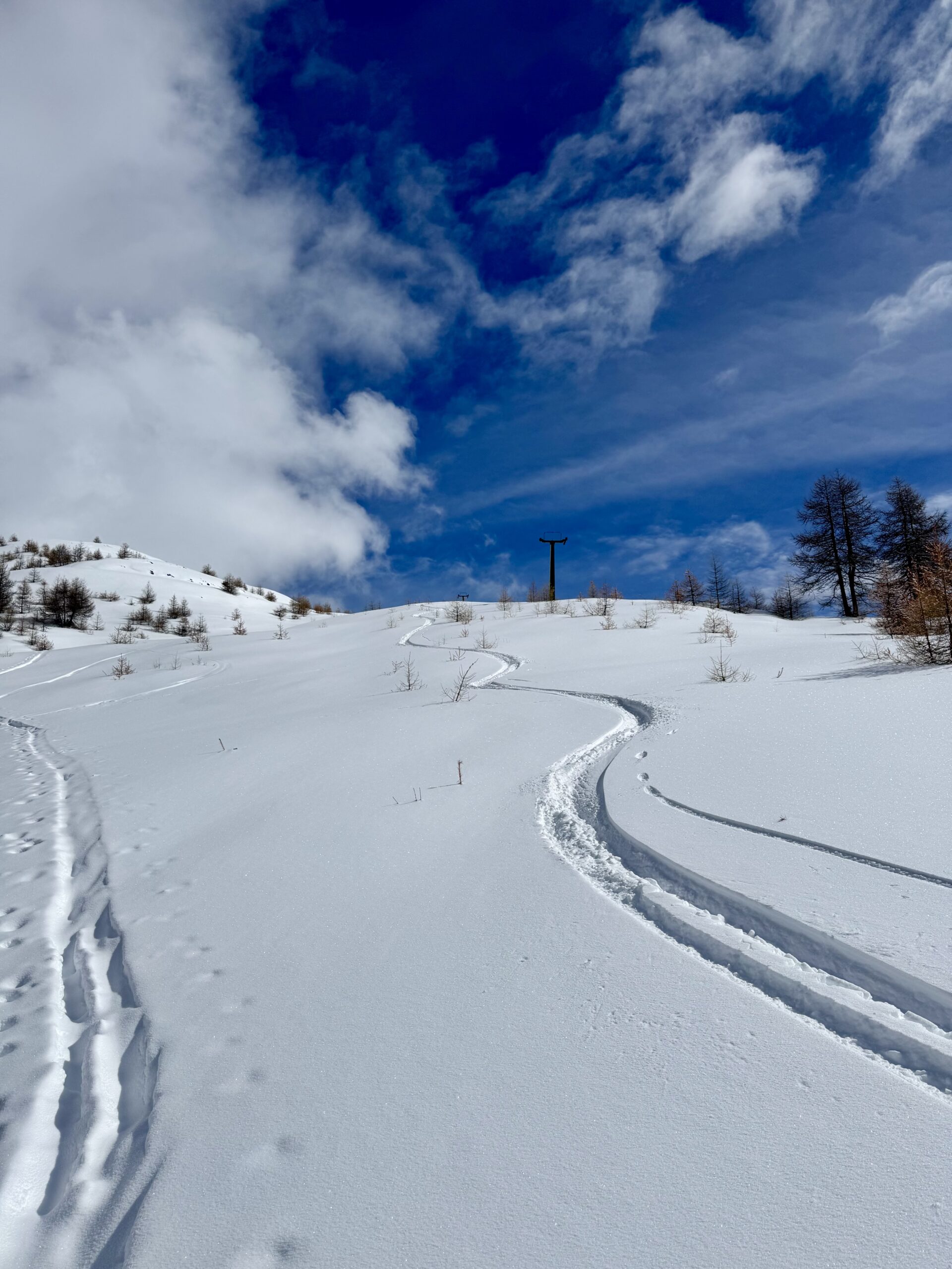 Neve dalla partenza, in basso poco deposito di neve nuova ma buon fondo presente, salendo si nota accumulo maggiore e buon spessore del manto nevoso. In alto direi situazione ottima con neve al mattino ancora polverosa. Salito in cima alla punta del Clot poi visti i pendii non tracciati lato Pattemouche sono sceso lungo la vecchia pista (ormai con zone invase dai pinetti come per quella su Pragelato) su neve già scaldata dal caldo e dal sole ma comunque godibile, il vento ha già lavorato parecchio sia qui che anche guardando Morefreddo e Vallonetto si notano parecchi accumuli e slavine partite.