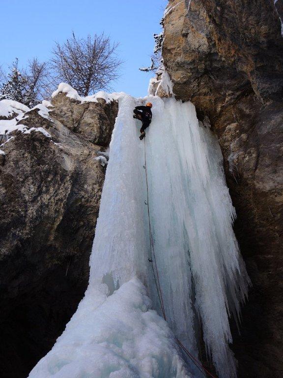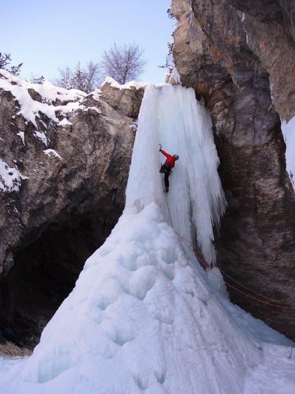 Abbiamo salito il sigaro in centro seguendo una rientranza fra il cilindro di sx ancora bucato in basso e la candela di dx in formazione e sul lato sx seguendo la parte più spessa del cilindro stesso. Nella rientranza e sull’uscita del tiro di dry tooling colava acqua nonostante la temperatura di -11° costante tutto il giorno. Il tiro superiore al momento non è ancora formato. Abbiamo salito anche il tiro di misto a dx del sigaro con aggancio impegnativo e bagnato in spaccata sul sigaro all’altezza del tetto.