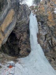 Calati dal larice (cordoni+maillon), sosta a spit non trovata. E poi un’altra breve calata su sosta a spit sul masso a centro canale.