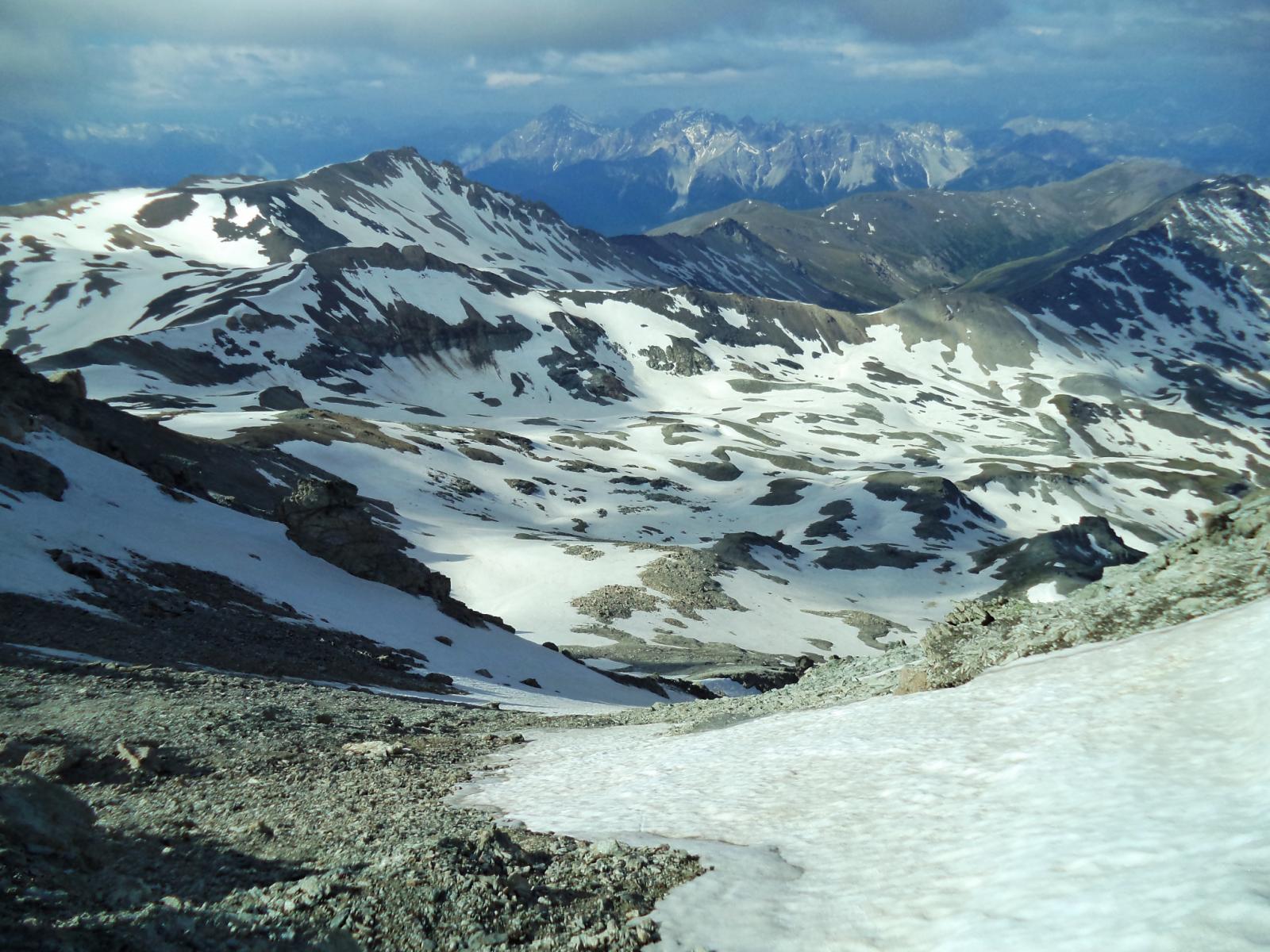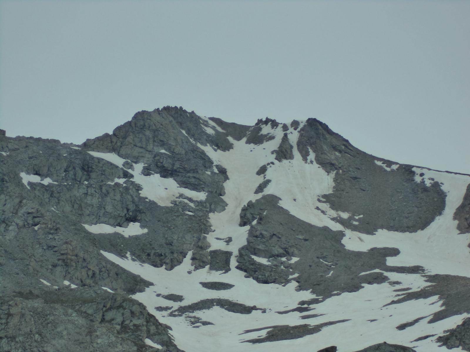 Dopo aver salito la parete nord discesa per il canalone ovest (la normale è ormai quasi senza neve). A mio avviso non conviene scendere dopo le 9.30, max le 10. Primo tratto senza neve quindi 2 alternative: o si scende nel canale a piedi per un centinaio di metri scarsi, o si scende sempre a piedi un breve tratto di cresta S fino a reperire un colletto innevato che dà sul canale (io ho seguito la prima ma consiglierei la seconda). Il canale in basso è un po’ concavo e presenta una strettoia e un po’ di pietre in mezzo, quindi a circa metà ho tagliato a sx su neve più liscia, continua e con meno pietre.Vallone quasi in piano con neve via via più butterata abbastanza noioso; un po’ di gava e buta e qualche risalitina per scendere il più possibile sci ai piedi: sono arrivato fino a quota 2600 ca ma la neve è ormai troppo sporca e a onde e non permette una sciata piacevole.