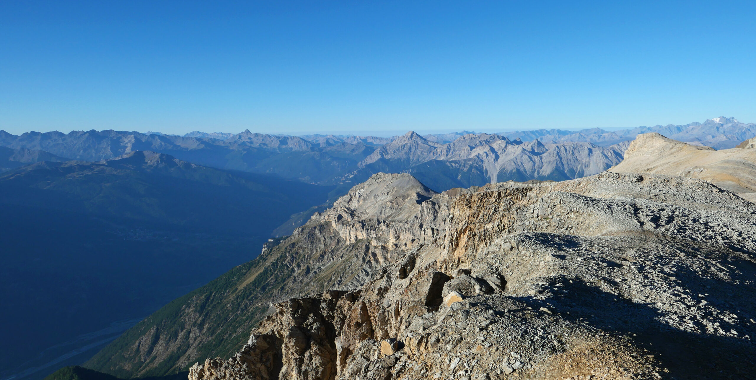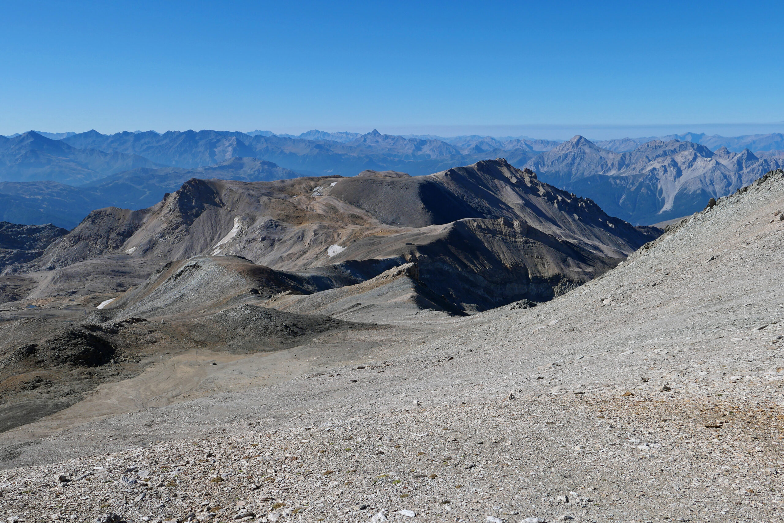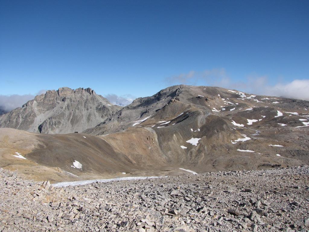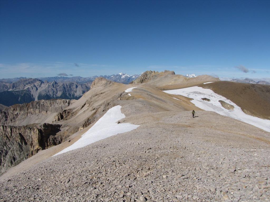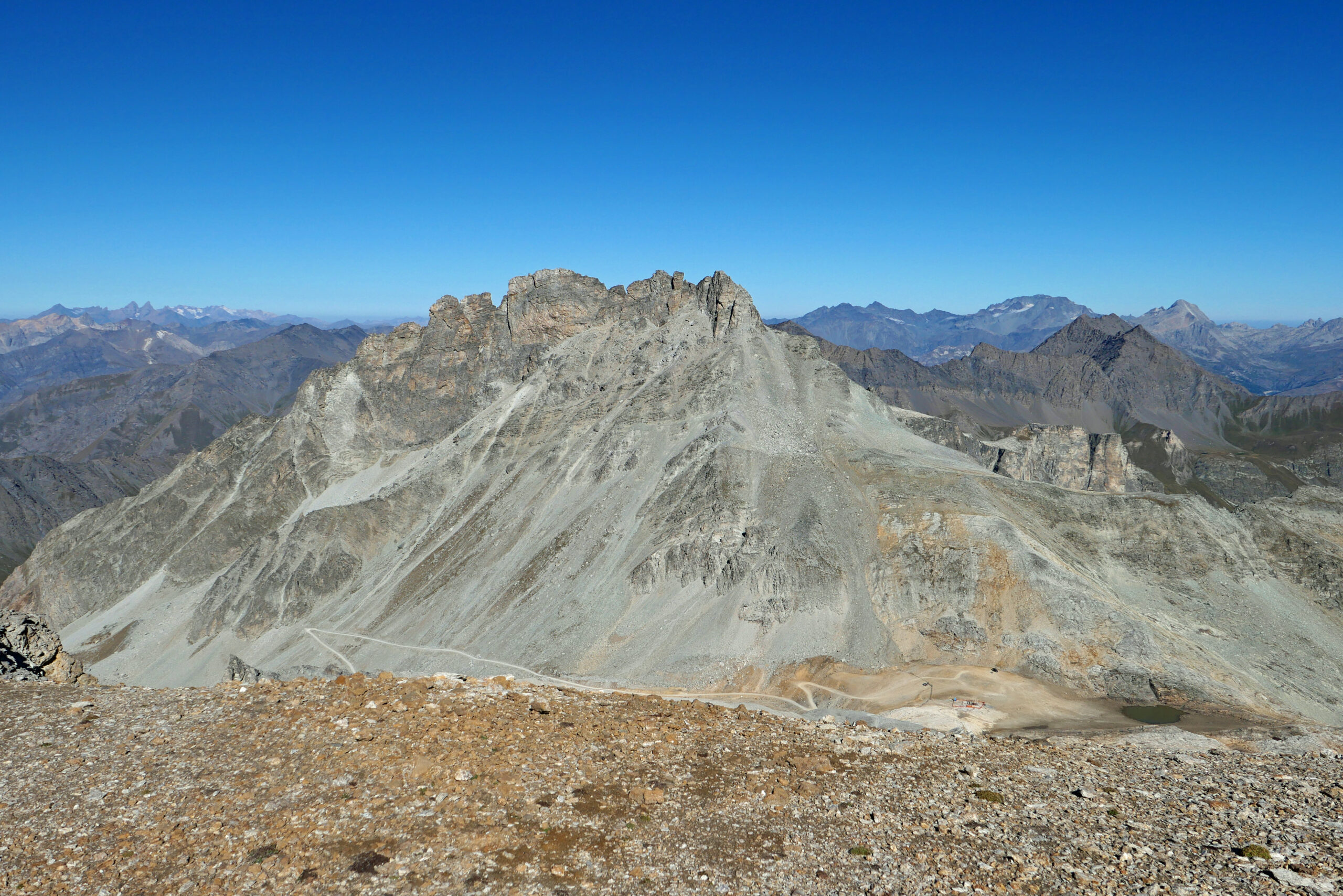 Dalla vetta, da cui si gode un’ottima vista sulla Rognosa d’Etiache e sulla Pierre Menue, oltre che su tutta l’alta Val di Susa, si ridiscende al Passo dei Fourneaux Meridionale. Questa volta, si segue la cresta di destra, che si dirige verso Nord e in breve tocca il Passo Centrale dei Fourneaux (3110m), per poi salire ripida ad una piccola e tozza sommità detritica (innominata) su cui è collocato un ometto e una piccola statua della Madonna. Da qui, si scende al Passo Settentrionale dei Fourneaux (3159m) e si raggiunge la vetta della Cima dei Fourneaux (3207m), cocuzzolo di calcare giallastro che termina con un salto verticale a Sud e a Ovest. Tornati al sentierino di cresta, passando a destra di alcune asperità rocciose, si perviene alla vetta della Punta Sommeiller (3332m). Da qui in pochi minuti si raggiunge per tracce la cima del Monte Ambin (3264m) Per la discesa dalla vetta, si può seguire il percorso di salita, oppure scendere al Passo Settentrionale dei Fourneaux e poi percorrere la conca di pietrisco che scende a sinistra del passo, costeggia alcuni laghetti e raggiunge i baraccamenti militari diroccati siti poco oltre il Bivacco Sigot (variante sconsigliabile in caso di nebbia data l’assenza di sentieri).