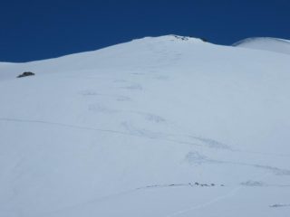 Canale di amiane bello pieno di valanghe. Colletto quota 2820 complicato causa accumuli, Ultimi pendiii con cautela, sentiti grossi assestamenti. Quasi ovunque neve farinosa.