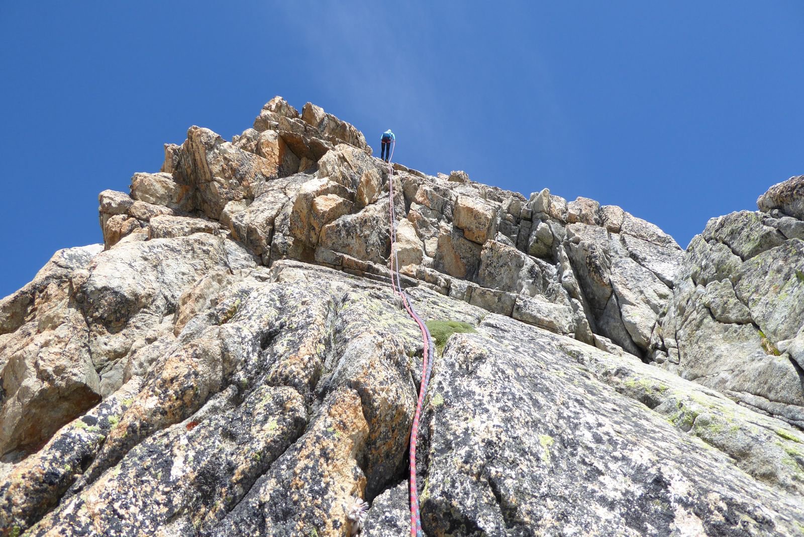 Si segue ora la cresta di blocchi facile ma esposta fino ad una prima elevazione dalla quale scavalcando altri grossi blocchi si raggiunge il punto culminante poco più elevato.