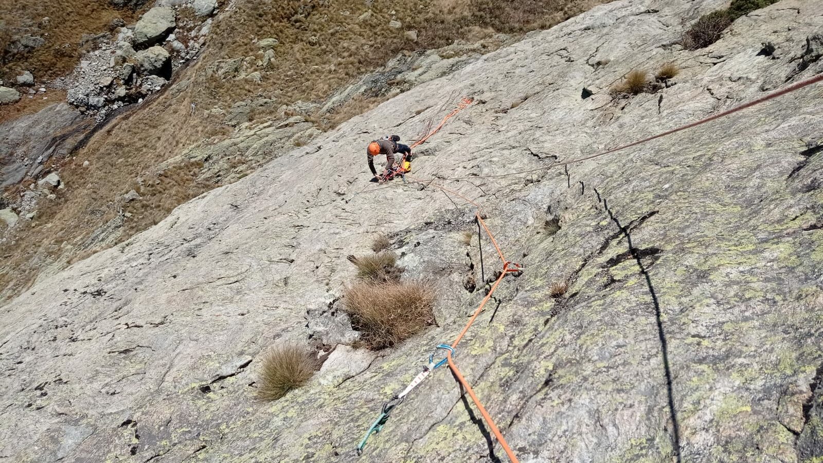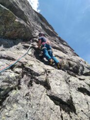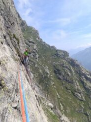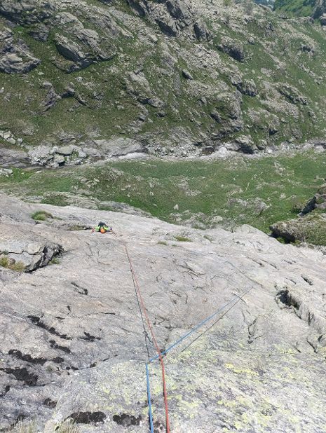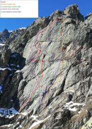 - L1: Dal primo fix si sale obliquando gradualmente verso destra, su evidente placconata obliqua di gneiss molto lavorato. 5b, 1 chiodo 25 m, possibile integrare. (Gradazione originale IV) Sosta su 2 fix kinobi, in comune con “Leggendo..” e “Ombra..”