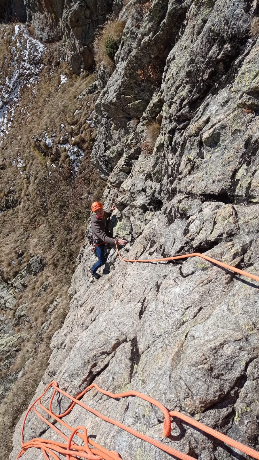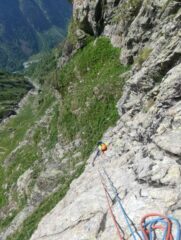 L4: dalla sosta andare a sinistra sulla cengia per 15 mt fino a sosta successiva, nuovamente in comune con “Leggendo..” 3b, traverso esposto ma facile, sprotetto.