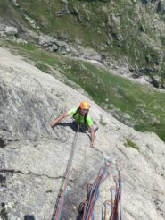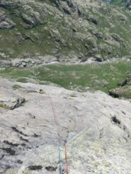 Dalla base della parete, ancora possibile calarsi per tutta la lunghezza del pendio finale con 4/5 doppie o mancorrenti da 60 mt. Ancoraggi su singolo spit da 8mm in genere sulle rocce a destra scendendo. In questo modo si risparmiano un poco le ginocchia sul prato ripido.