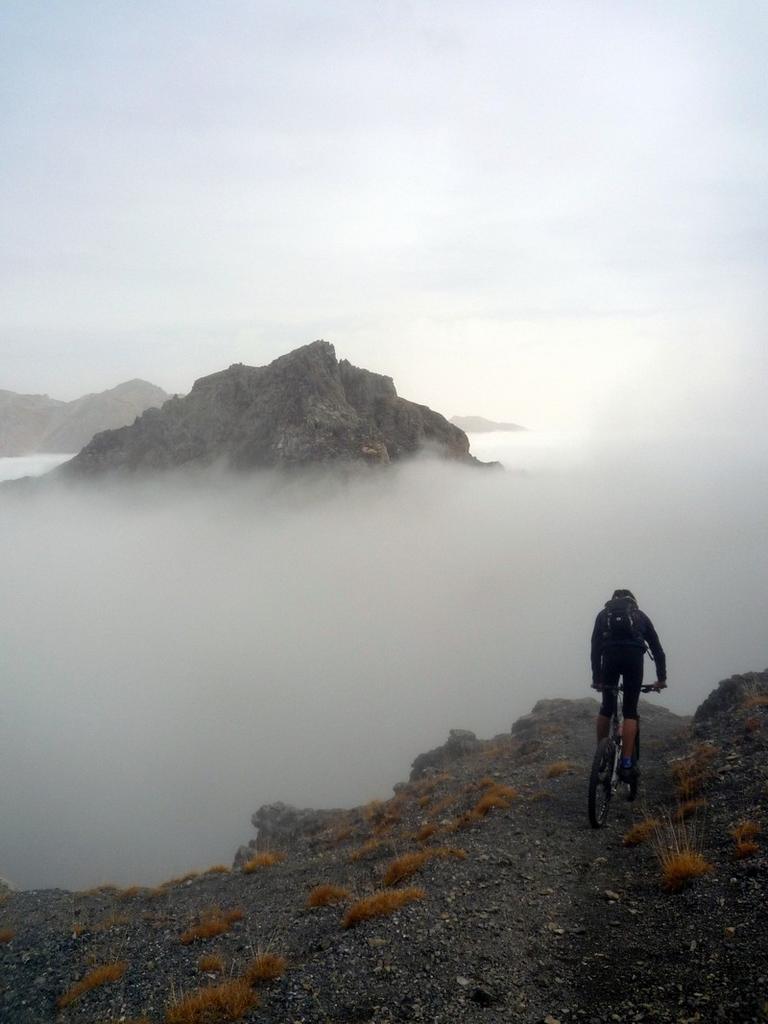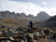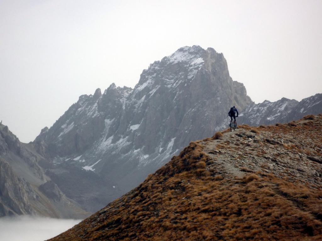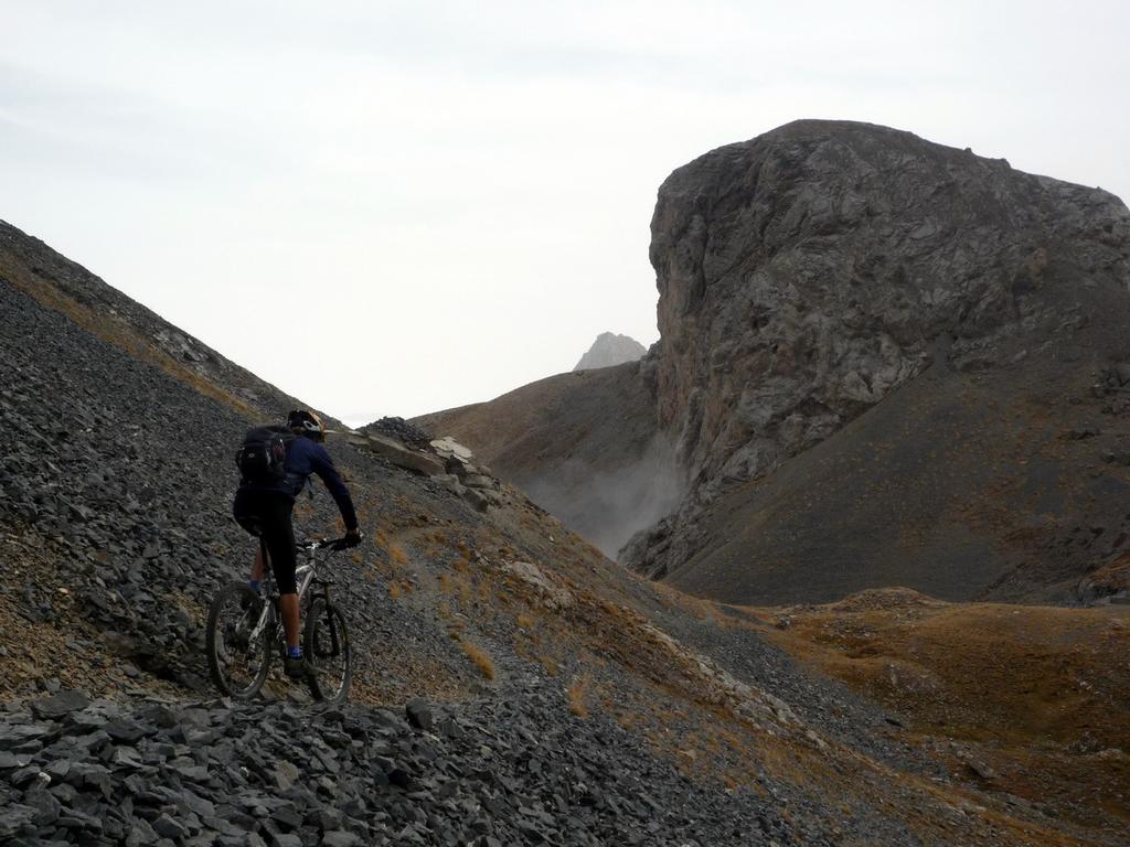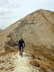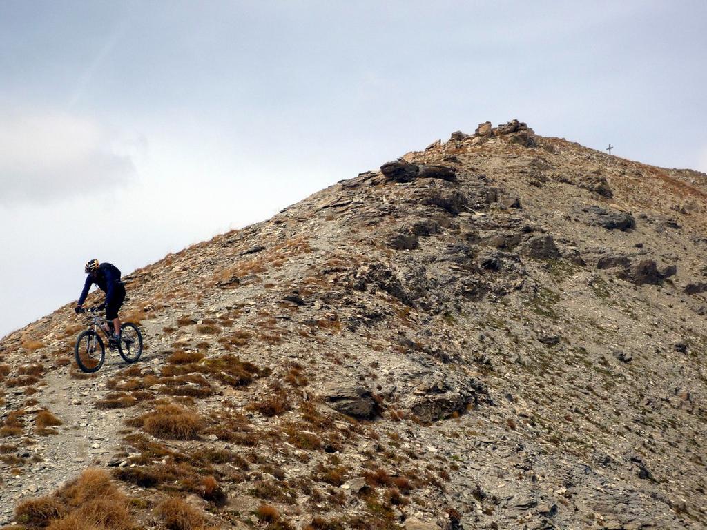Si ritorna indietro per pochi metri sul sentiero ghiaioso fino ad imboccare una traccia sulla destra, e in salita, con bici in salla, si raggiunge la cima del Monte Soubeyran (2697 mt).