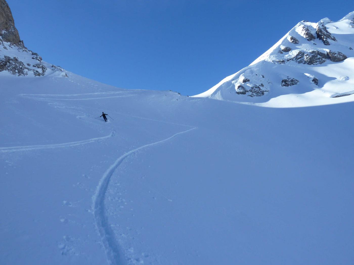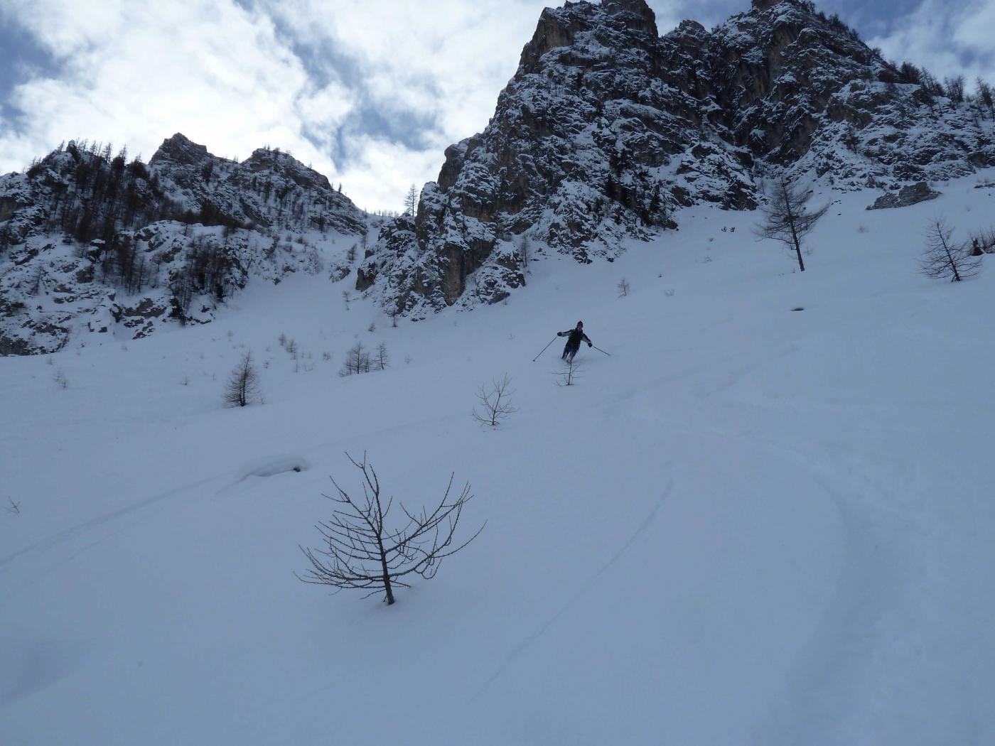 L’ultima nevicata ha portato 15 cm. di farina leggera che però si è salvata solo nella parte bassa xchè in alto il vento ha scombussolato parecchio le condizioni. In alcune zone tipo sui dossi la neve è stata completamente spazzata via mentre negli avvallamenti e nelle conche si trova anche 1/2 metro di farina compressa. Il pendio sotto il Soubeyran sceso su neve ventata portante mentre nel vallone sotto il passo della Cavalla abbiamo cercato di sfruttare alla meglio i tratti con la neve vecchia dura che ci hanno offerto una sciata migliore. Giunti alle Grange Pausa ripellato per seguire la traccia di 3 scialpinisti, che ringraziamo, diretti al M.Viraysse. Sotto il colle del Sautron dietro-front con discesa in farina pressata fino a quota m.2000 poi bella polvere ma occhio alle pietre nel tratto poco sopra la stradina che porta a Saretto.