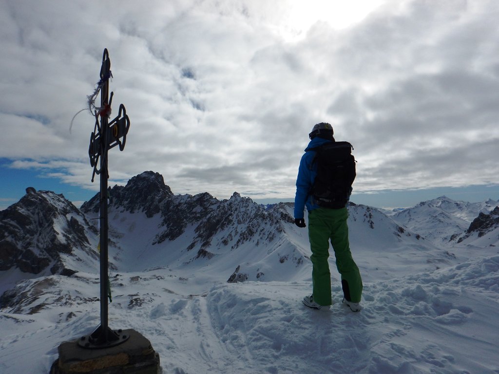 Saliti al Soubeyran da grange Pausa per il versante nord est ed il pendio-canale tra la nostra cima e l’Aiguille Barsin. A parte la morena sopra la croce di Caraglio, completamente spazzolata, abbiamo trovato mediamente una spannetta di farina su fondo duro, pur alternata a placchette e tratti più ghiacciati. Dal colletto alla cima neve marmorea sul versante sud ma innevamento continuo anche in dorsale.