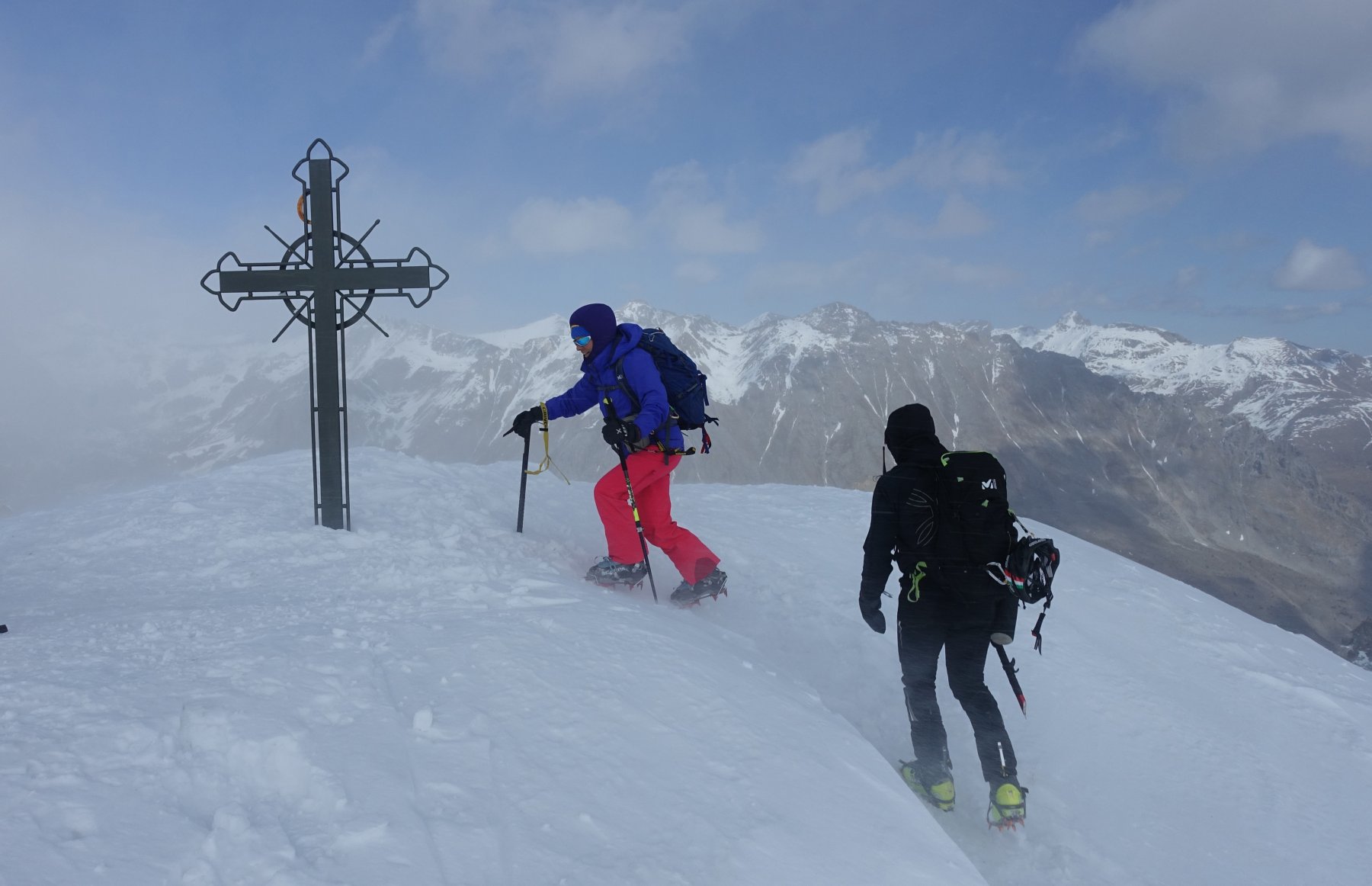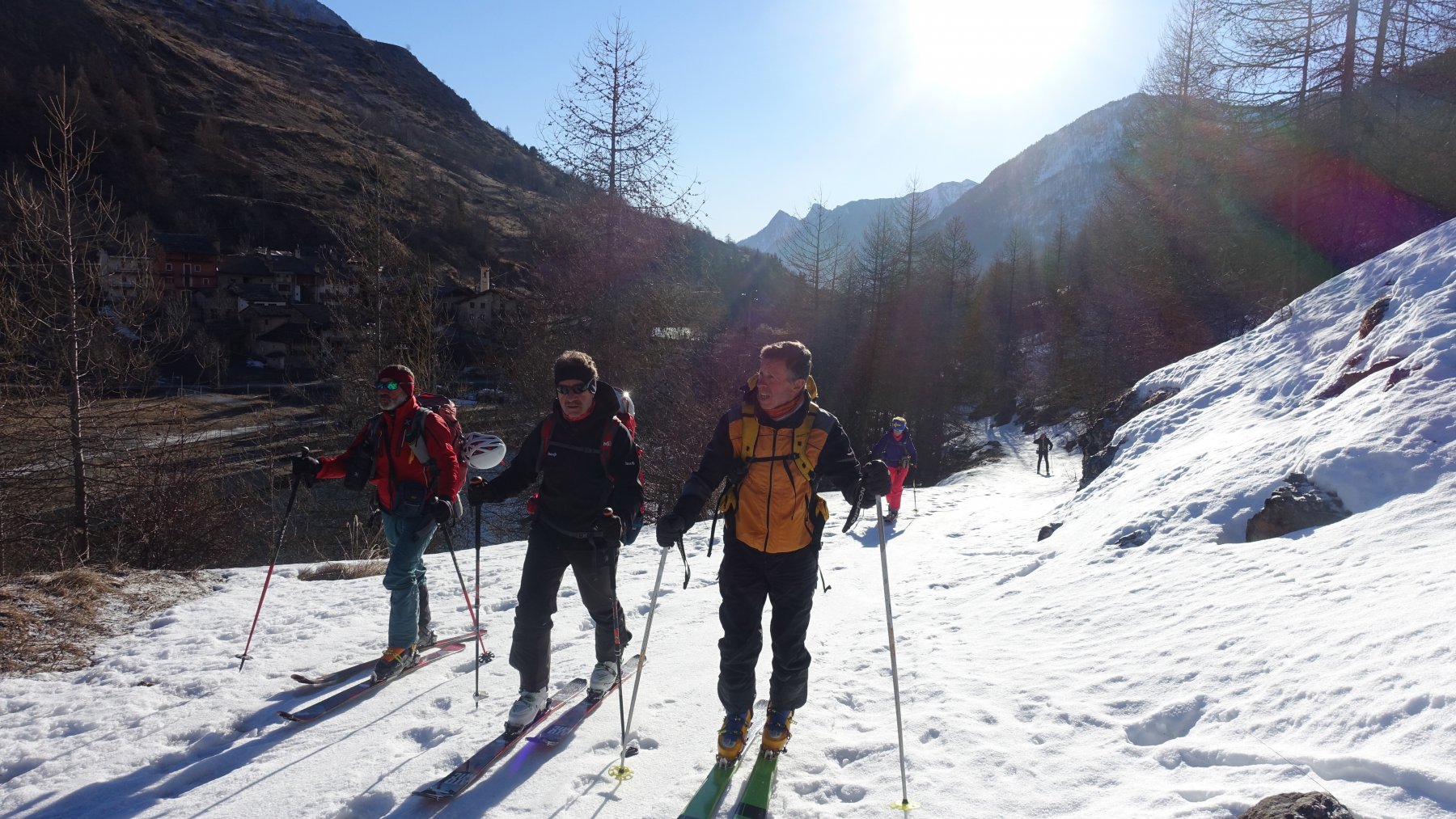 La cosa bella è che la neve c’è da subito sulla sterrata che parte da Saretto grazie al paio di cm della notte, con qualche piccola interruzione. La giornata è bella, ma il vento fastidioso è in agguato, infatti appena superiamo la Grangia pausa ed entriamo nei dossi dei prati Murtier Eolo si scatena con raffiche sui 30-40km/h. Comunque ben vestiti proseguiamo passando vicini al colle della Fea e poi raggiungiamo il Passo della Cavalla dove finalmente vediamo la cima 150m più in alto. Il vento è sempre forte, un gruppo di francesi pensa bene di fare dietro front. Noi stoicamente continuiamo la lotta con l’Alpe. E in qualche modo: con sci o con ramponi raggiungiamo la cima. Pausa breve e discesa con alcuni fazzoletti di farina in alto e nella parte mediana; discretamente dura in basso. Ambiente sempre eccezionale.