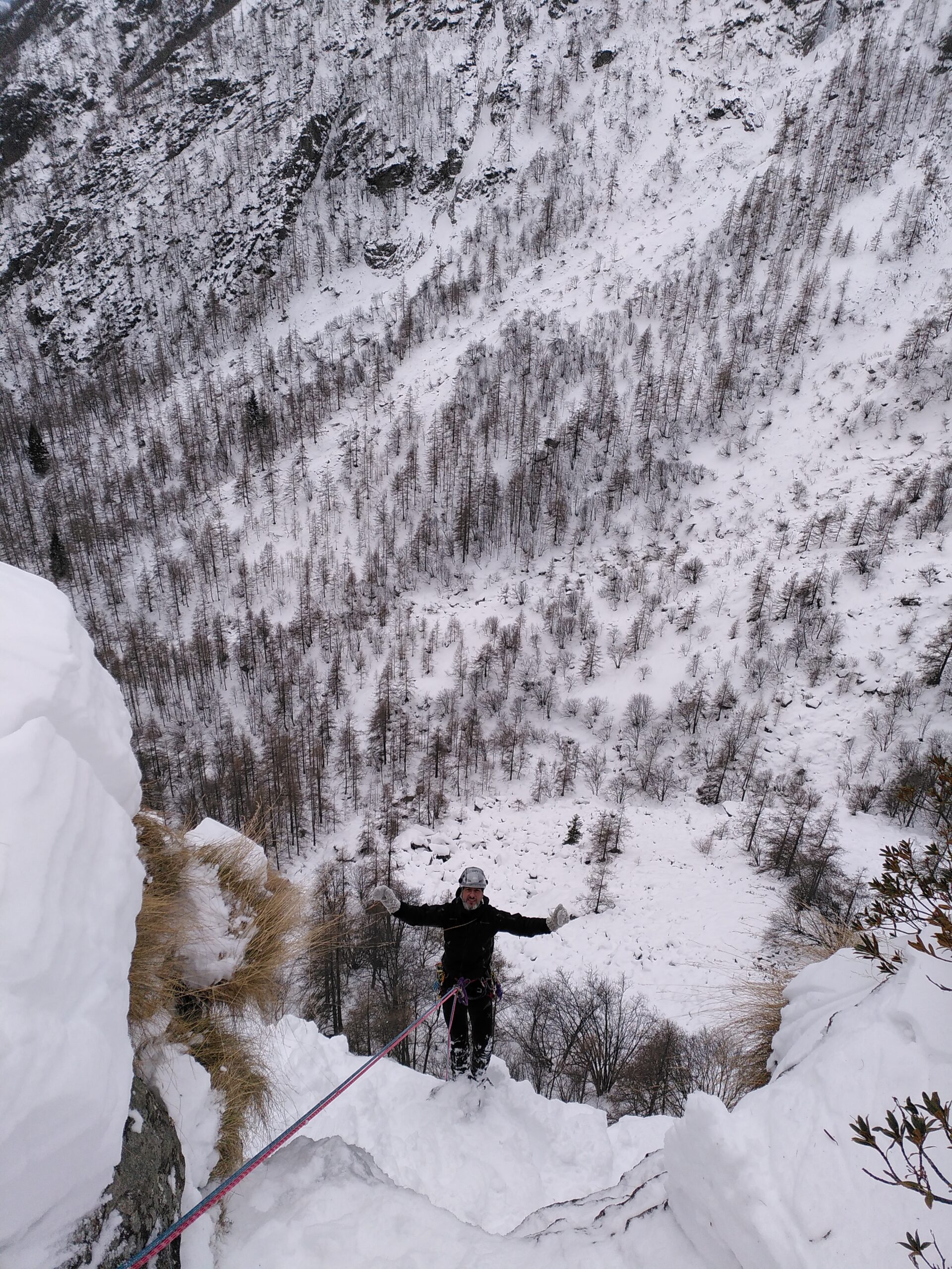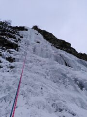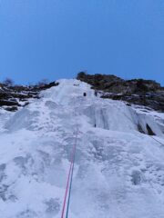Cascata nel complesso ben formata con la possibilità di seguire diverse linee dal 4 al 5 grado. Noi abbiamo seguito la parte centro/sinistra, e abbiamo dovuto evitare il tratto iniziale della prima colonna perché troppo bagnato. Fatto la cascata in tre tiri con soste su ghiaccio (la seconda in un bel grottino). Molto bello il muro finale. Sulla dx dopo il primo tiro si trova una sosta su chiodi marci, ma abbiamo preferito fare sosta su ghiaccio, come anche la successiva per necessità non essendoci alternative. Discesa in 2 doppie: la prima dall’alberello (l’abbiamo rinforzata con un nuovo cordone) e la seconda su abalakov.