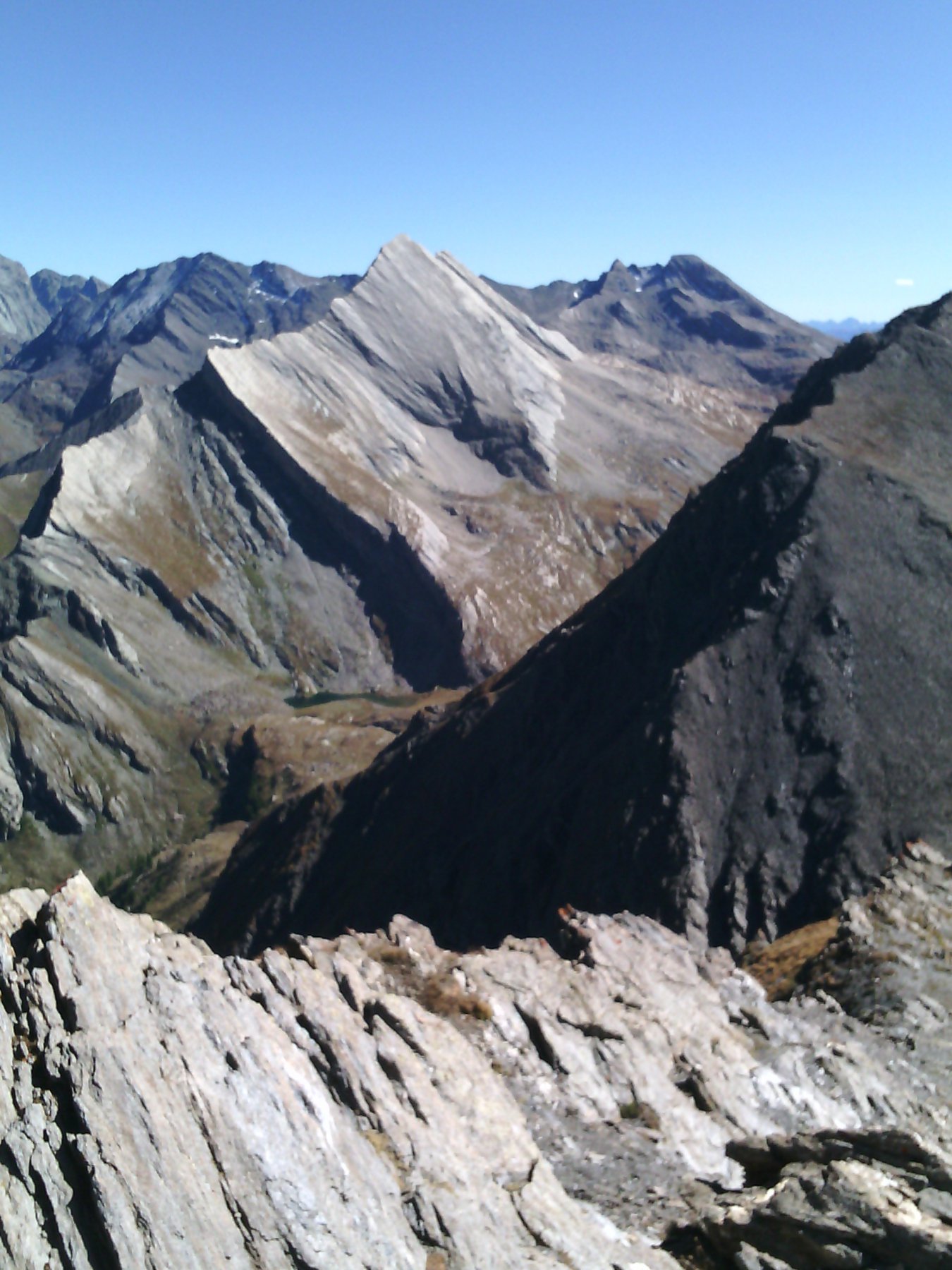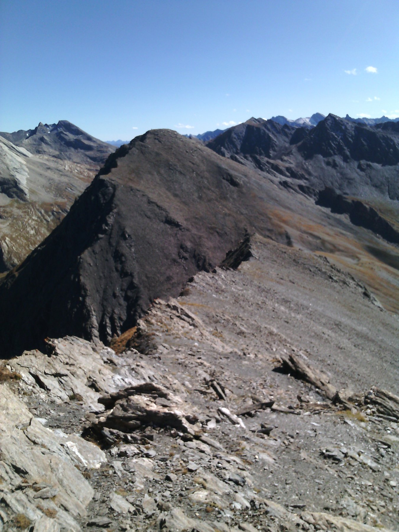 Dopo i 2 laghetti Lacroix solo vaghe tracce di animali e ometti solo nella parte finale in prossimità della spaziosa punta. Sceso al colle detritico a nord della medesima, con altri 180 m di dislivello (per un totale di 1550 m) raggiunto anche il roccioso Pic Ségure 2990 m.