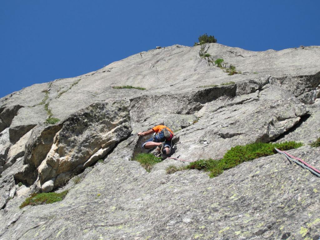 4)facile placca,risalti, fessurina e poi placca verticale lichenosa (okkio), ristabilimento in uscita.50m 6a+ (pochi fix)