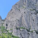 muro fessurato atletico e poi placca verticale con fessure svasate che richiedono ottima tecnica e padronanza del grado obbligato.30m 7a