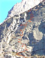 Salire direttamente la placca lavorata soprastante fino a un chiodo 5c (5 metri e nessuna possibilità di protezione). Reperire una cornice a destra, che si allarga un pò con qualche gradinetto 4c e 5b, oltrepassare uno spit artigianale e poi 2 chiodi ancora a destra 5c, fino a una placca verticale. Salire direttamente (A1 su due spit) e afferrare una lista su cui occorre ristabilirsi per alzarsi allo spit successivo (A1 su cliff se si continua in artif per scalettare lo spit successivo). Vincere il duro muro compatto superiore 6c+ o A1 su due spit e afferrare un gradino arrotondato ascendente verso sinistra, sul quale ci si alza seguendolo poi a sinistra fino alla terrazzina erbosa superiore. Percorrerla verso destra 5 metri e sostare su due spit (S4). Ancora un passo a destra, poi salire con passi delicati su una cornicetta verticale (6a e nessuna possibilità di protezione). Salire oltre una piccola convessità liscia A1 e guadagnare una cornice che permette di uscire in libera fino a 1 spit artigianale 6b+. Traversare a destra e seguire la cornice che ora diviene rovescia (2 chiodi)ed è giocoforza staffare il secondo chiodo issandosi allo spit successivo A1. Salire con un gioco di staffe nel muro espostissimo nel cuore della placconata A1 (spit e all’occorrenza i vecchi espansione di Grassi!; con un breve passo di 7…per dita d’acciaio! nel mezzo). Dall’ultimo spit afferrare qualche gradino e raggiungere l’aerea S5.