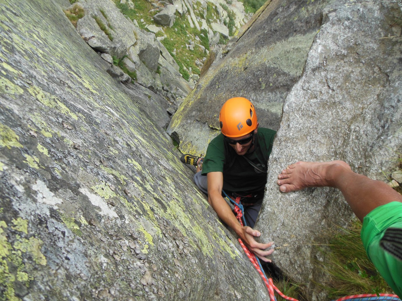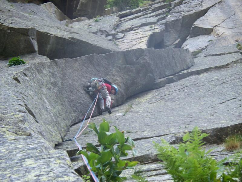 L5: dalla sosta traversare verso sinistra fino a raggiungere la fessura di fondo del diedro e scalarla in opposizione. Ribaltare a sinistra dove la fessura diventa off-width (incastro fisico con la spalla) e proseguire sulla fessura sovrastante fino alla base del tetto. Alzarsi in opposizione sotto il tetto e uscire verso destra fino a ribaltare sul terrazzino sommitale. 6B +; 30 metri