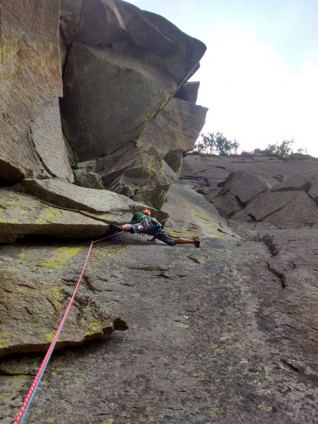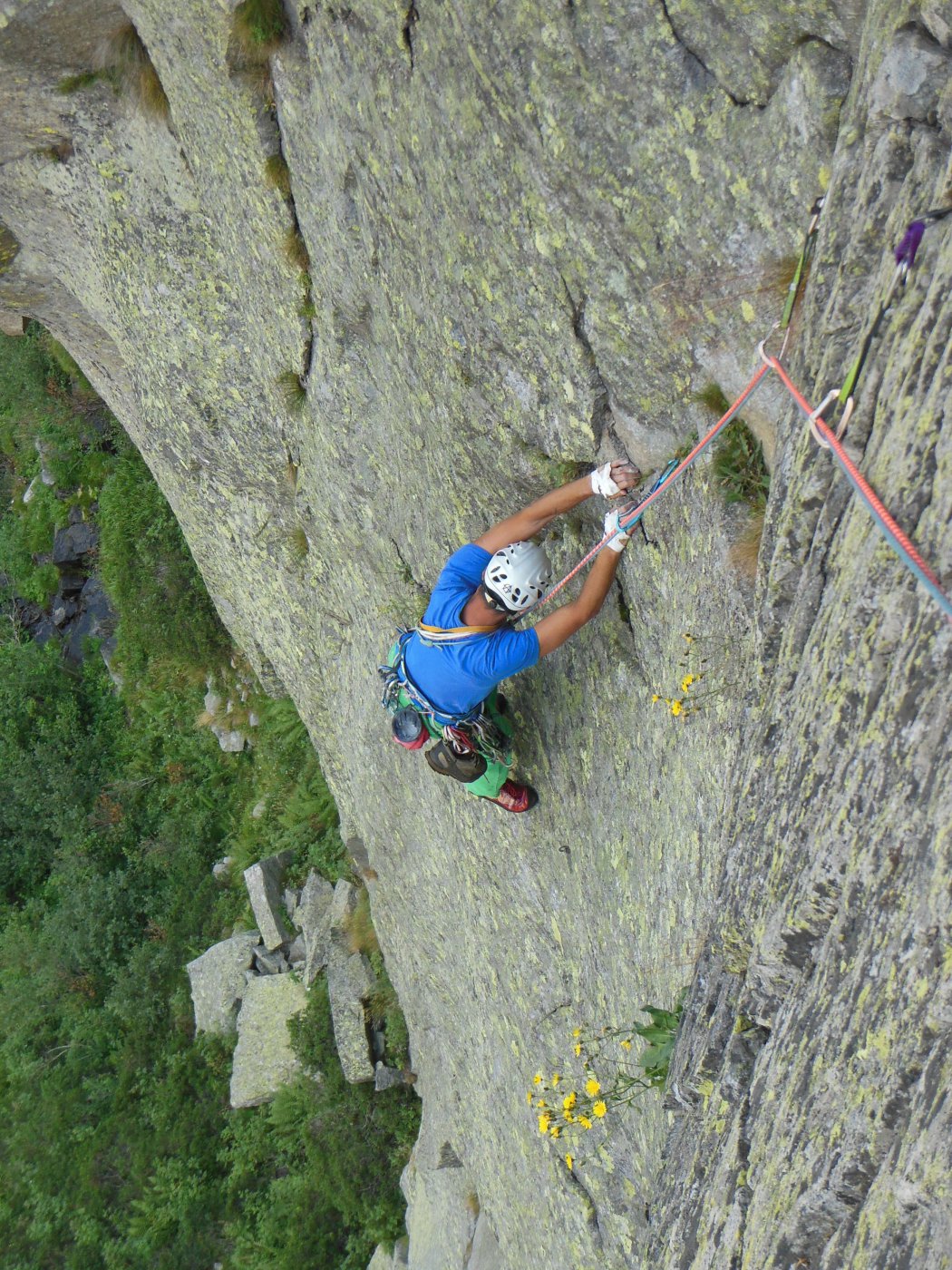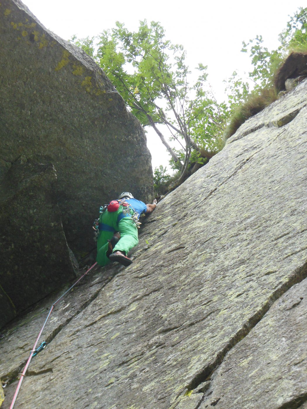 L4: risalire in opposizione la netta lama (5 BD utile) e ribaltarsi sul terrazzino sovrastante. Seguire il lamone rovescio e poi, sfruttando una buona lista per i piedi, spostarsi nel diedro articolato a destra.
