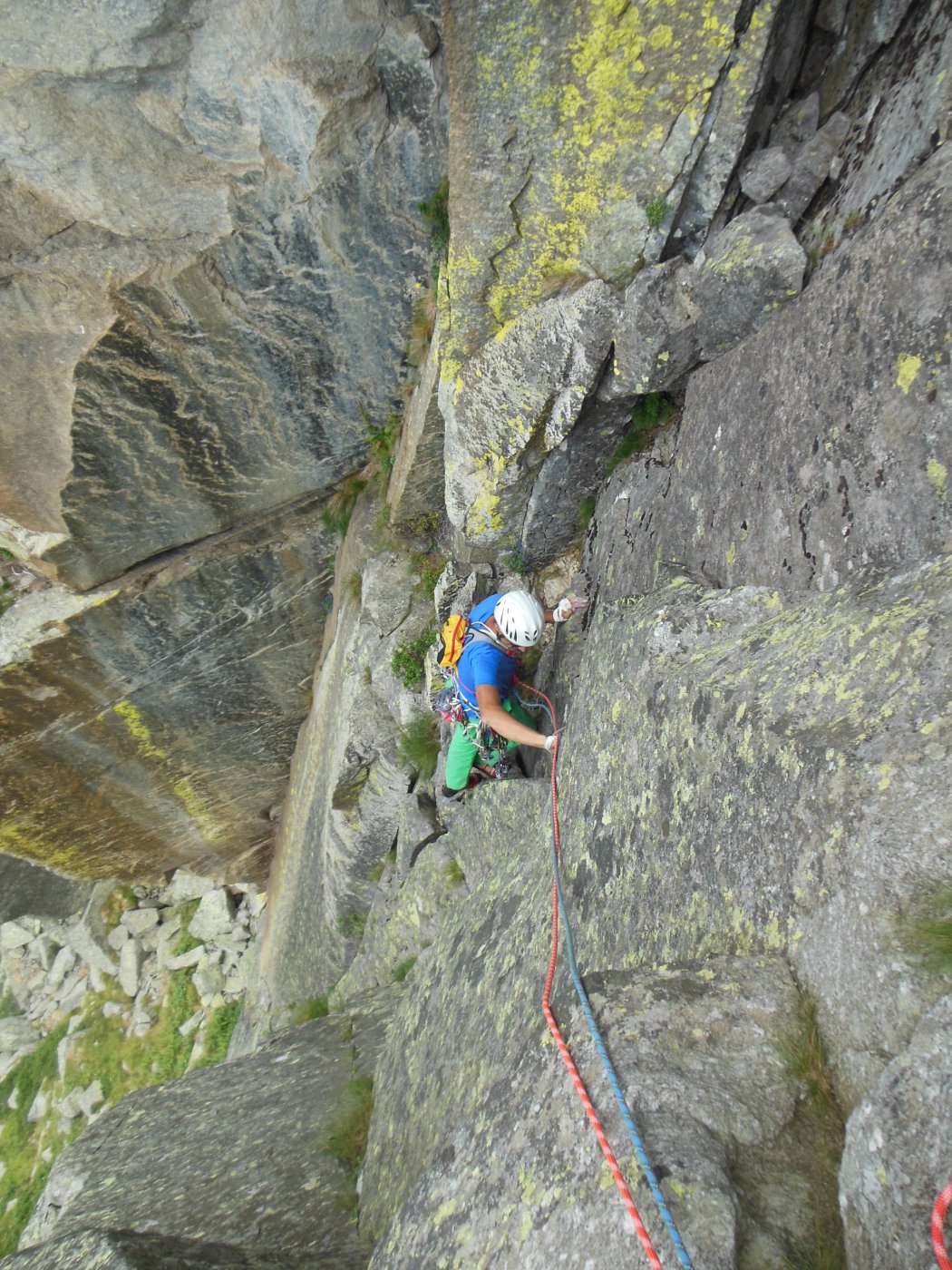 Attraversare la cengia senza percorso obbligato, obliquando verso sinistra fino a portarsi alla base dell’imponente diedro che caratterizza la seconda parte della via.