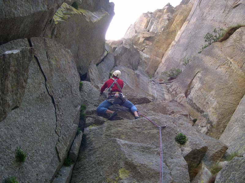 - L4. A destra per cengia (ch), poi fessura diagonale che incide una placca liscia (ch), poi uscire con bel passaggio su una cengia. Ancora per diedrini (ch.) sino alla S4 su spit, su cengia, 25m (6a).