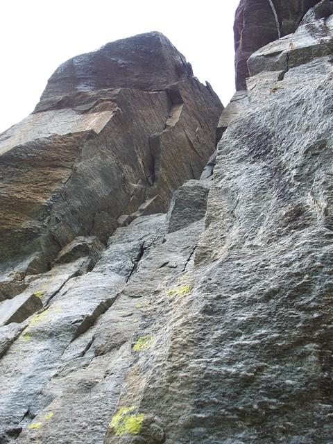 - L5. Ritornare a sinistra e cominciare a salire in strapiombo su ottime tacche nette (prima microfriend poi numerosi chiodi). Immettersi nel delta (camino) e scalare in opposizione sfruttando le ottime tacche laterali (numerosi chiodi) sino ad uscire dal camino, S5 lunghezza molto bella e dura, 30m (6c).
