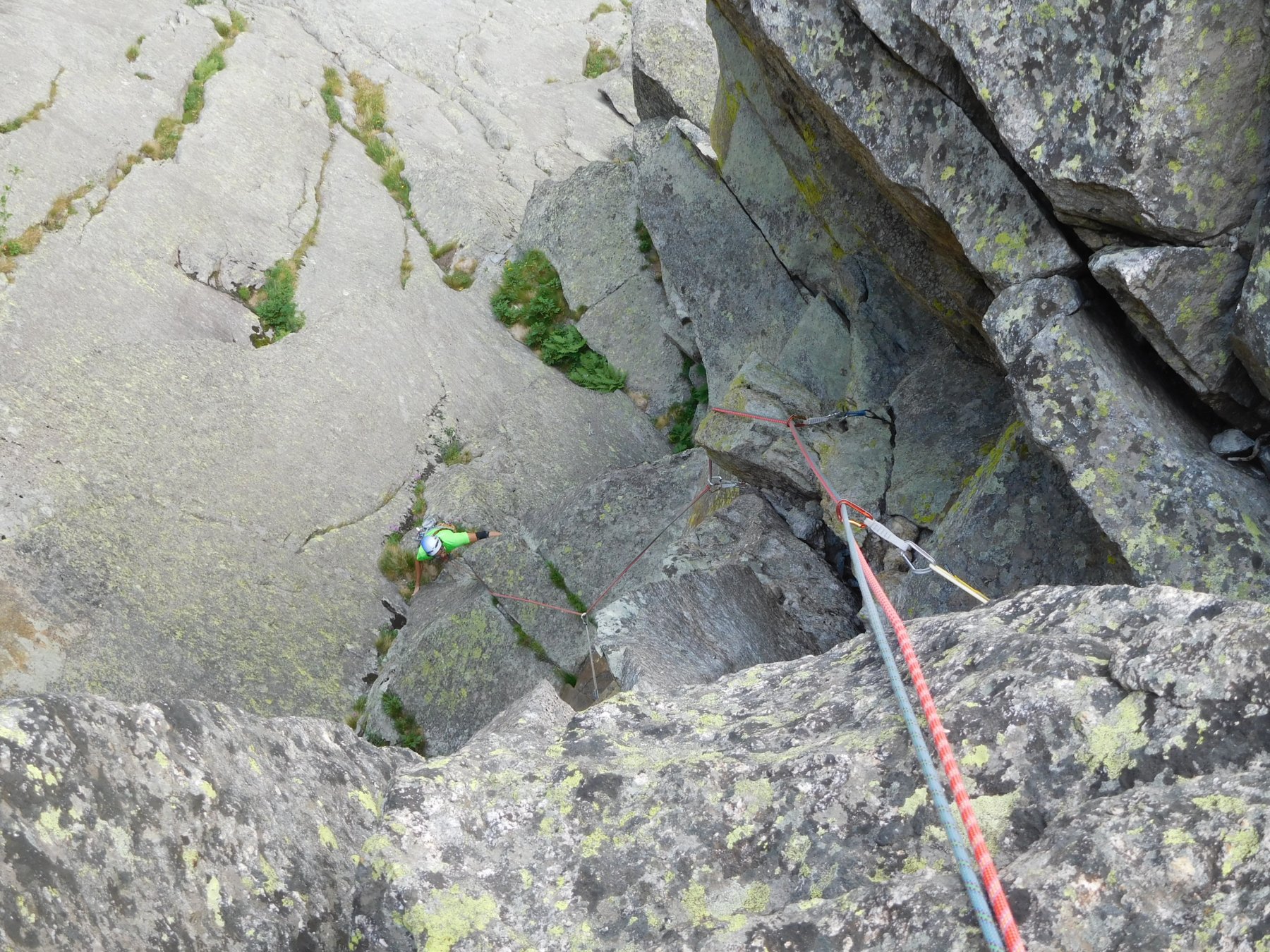 - L1. Scendere di 5 metri e individuare un chiodo con cordone. Salire per 4/5 m sino su una cornice, traversare orizzontalmente a sinistra (ch.) sino ad una piantina. Continuare orizzontalmente a sinistra sino nel fondo del diedro. Risalirlo (sprotetto IV) e superare uno strapiombino a sinistra che immette su un terrazzino erboso sotto un diedro a grandi lame e blocchi, S1 su spit, 40m (5b).