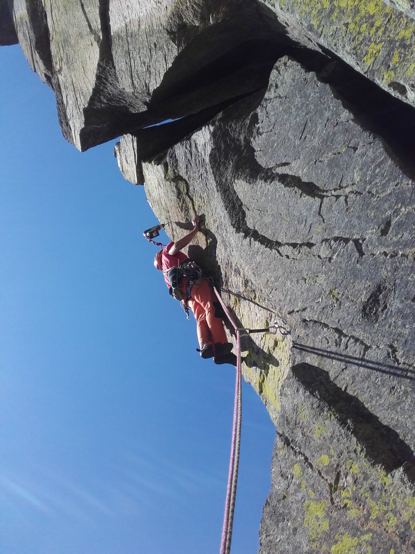 5° tiro) Tiro parzialmente nuovo 2017. Grassi era entrato nel camino per uscirne dalla parte opposta, la nuova variante sale invece l’estetico spigolo (3 fix) e prosegue quindi sul muro originale (3 fix nuovi). Uscire sul prato sommitale, sosta a dx su placca, 1 fix da collegare alla vicina sosta di calata (quella di Re Azul sempre al potere). Tiro con sezioni N.L.