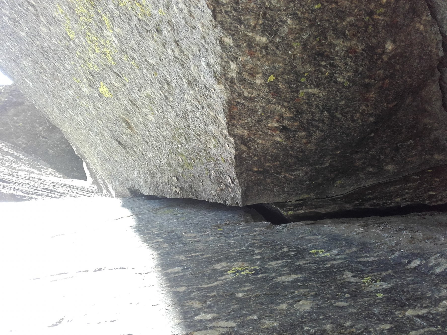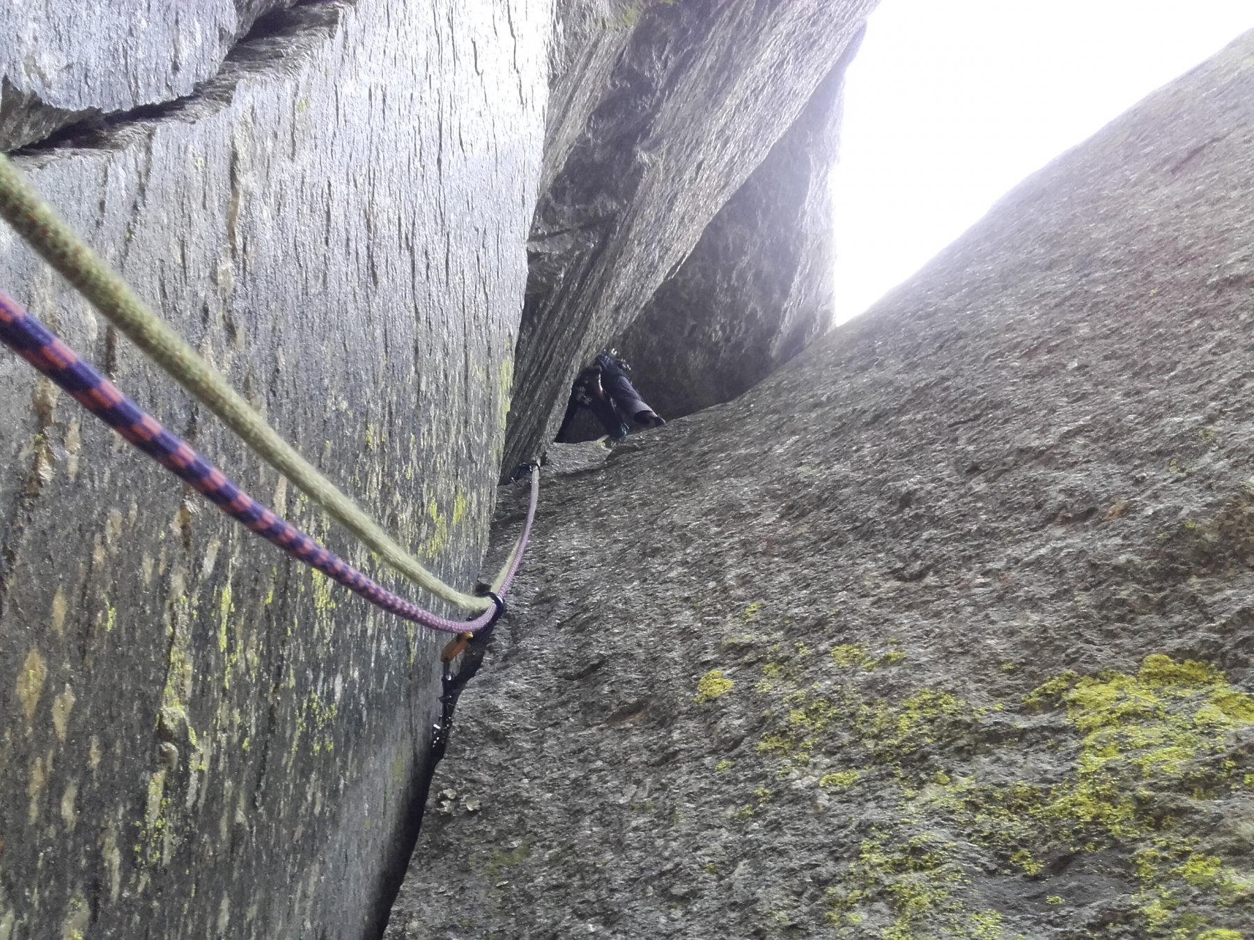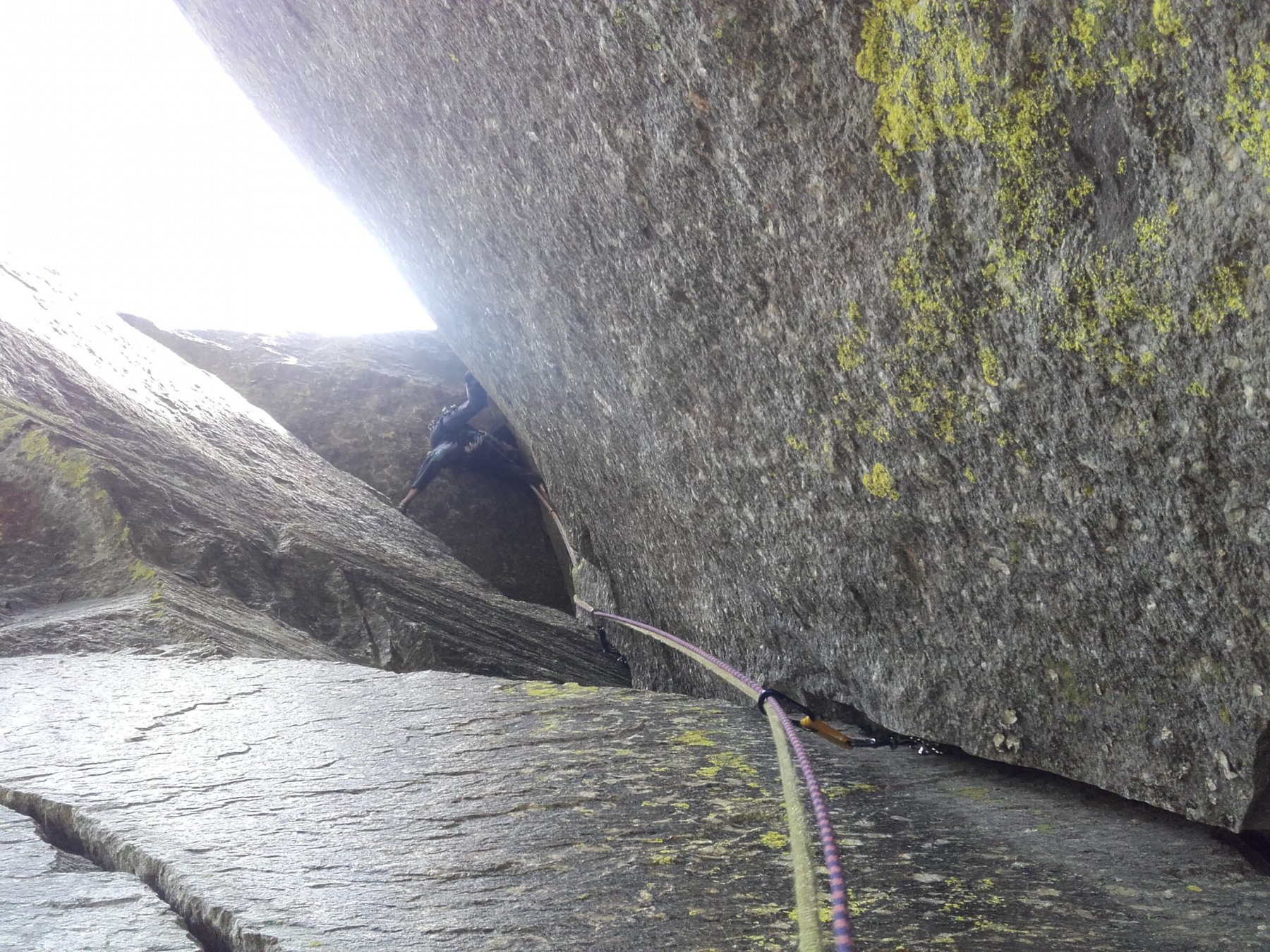 - L1- Salire il primo muro, direttamente o da sx…a seconda della statura…fin sotto una prua strapiombante. Aggirandola si perviene in sosta a sx. Grado 6B. 4 fix, friend 0.75BD.