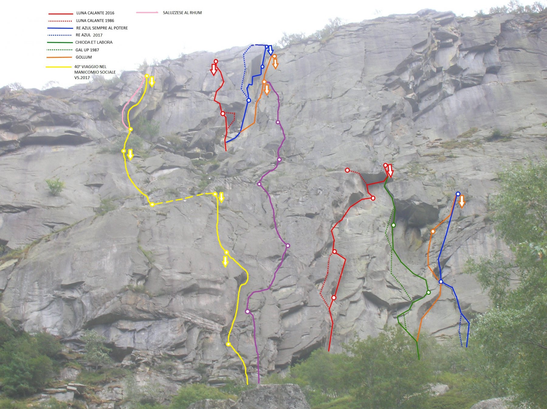 - L6 VARIANTE “Saluzzese al Rhum”-trattasi della fessura strapiombante a sx del diedro, salita il 23 agosto 2017 dal saluzzese Flavio Parussa insieme a Luca e Matteo Enrico. Liberata onsight da Michele Amadio il 04/09/2017 che propone il grado di 7B+ . Una serie di friends fino al n°2BD. Nella seconda parte, sul muro finale, si ricongiunge all’ultimo tiro di “Le placche dell’inferno verde” del solito Grassi e arrivante da sx (spit e chiodi in posto). Ancora un po’ da pulire il muro di questa variante, ma la fessura è a posto.