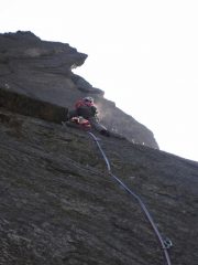 Bella via chiodata ottimamente con tiri tecnici per placche e muretti con fessurine, anche se il tiro più bello è il quinto con un bel diedro in dulfer.