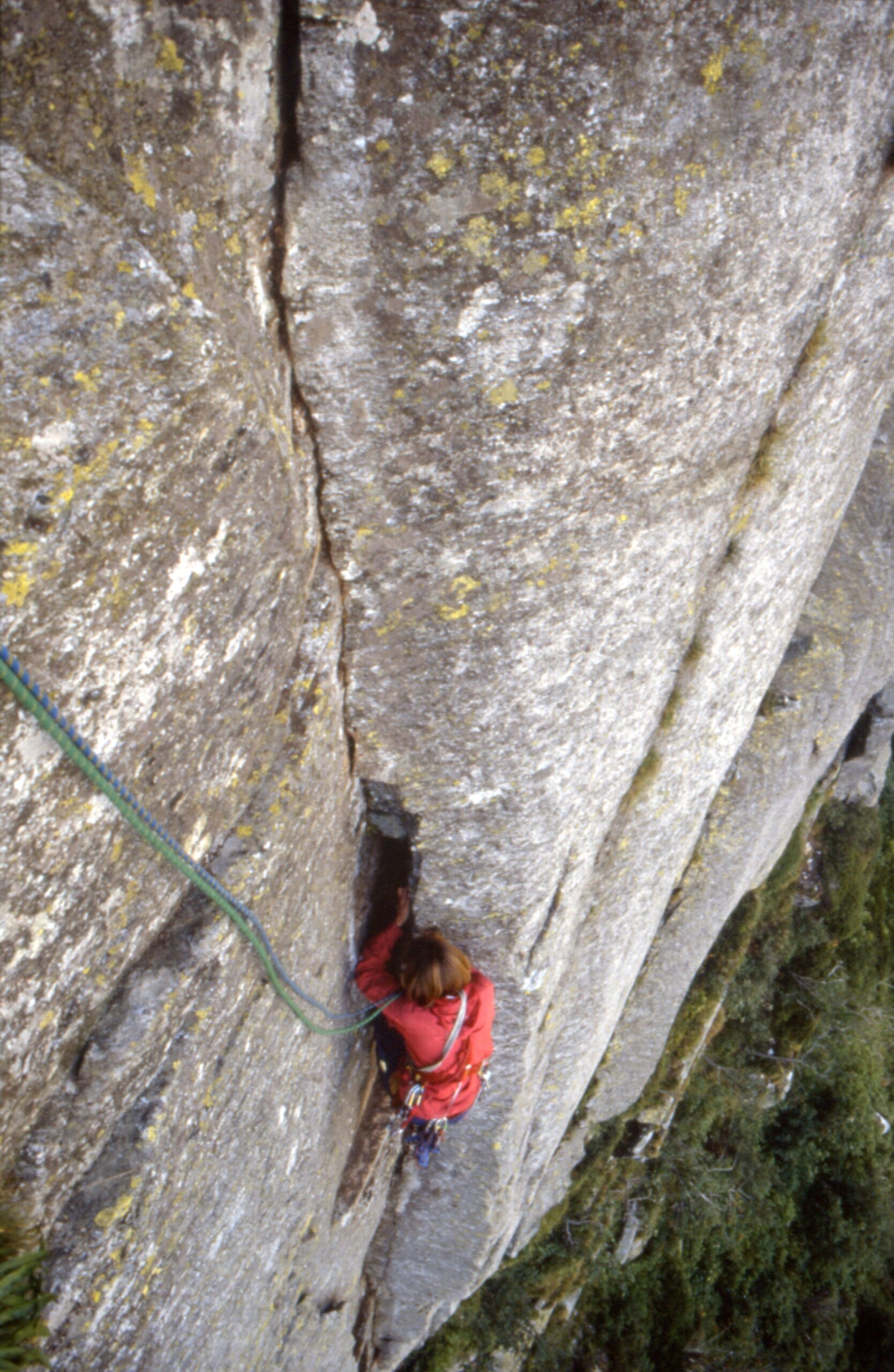 - L1: Attacco in corrispondenza di due spit fix non collegati. E’ il primo tratto che ora si percorre comunemente per accedere a Sogno di Sea (che in origine traversava per cenge e rododendri da sinistra). Dopo la bella fessura con alcuni incastri ring lock, e giunti alla cengia erbosa (chiodo con vecchia fettuccia), si traversa a sinistra per circa 15 metri in orizzontale, fino a raggiungere S1, due spit fix non collegati alla base di un bel diedro inciso da fine fessura. 5b 35 mt