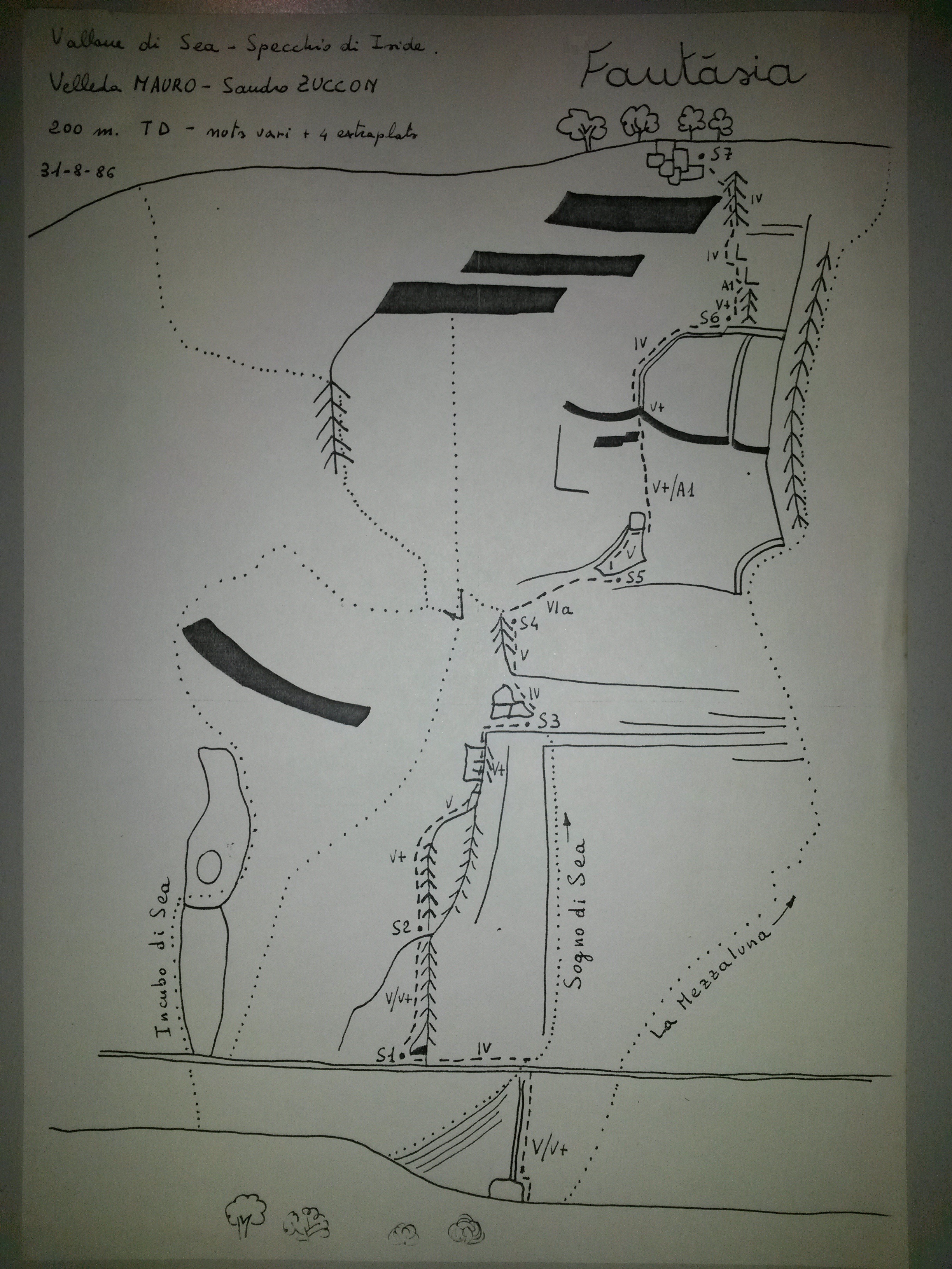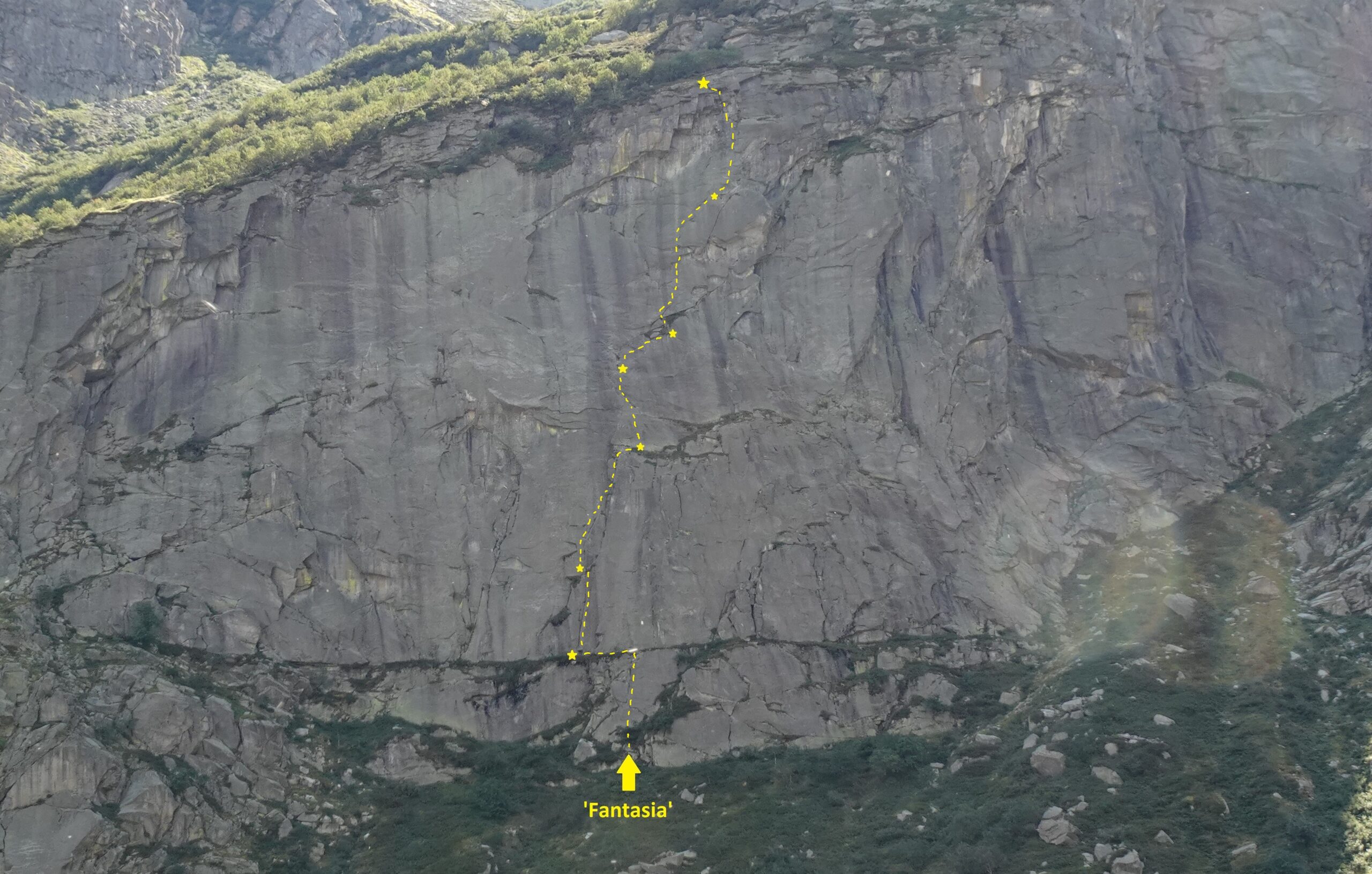 - L7: Da questa sosta sono visibili i fix nuovi della variante all’ultimo tiro di Riflesso di te Stesso vs. 2016, realizzata dai fratelli Enrico, che vanno verso destra in direzione di un muro compatto. Il percorso di Fantasia invece è diverso ed è stato “copiato” inconsapevolmente da Grassi durante l’apertura di Riflesso vs. originale (aperta qualche mese dopo Fantasia), con l’apposizione di 2 spit rock probabilmente piantanti dall’alto, e alcuni chiodi colorati di rosso.