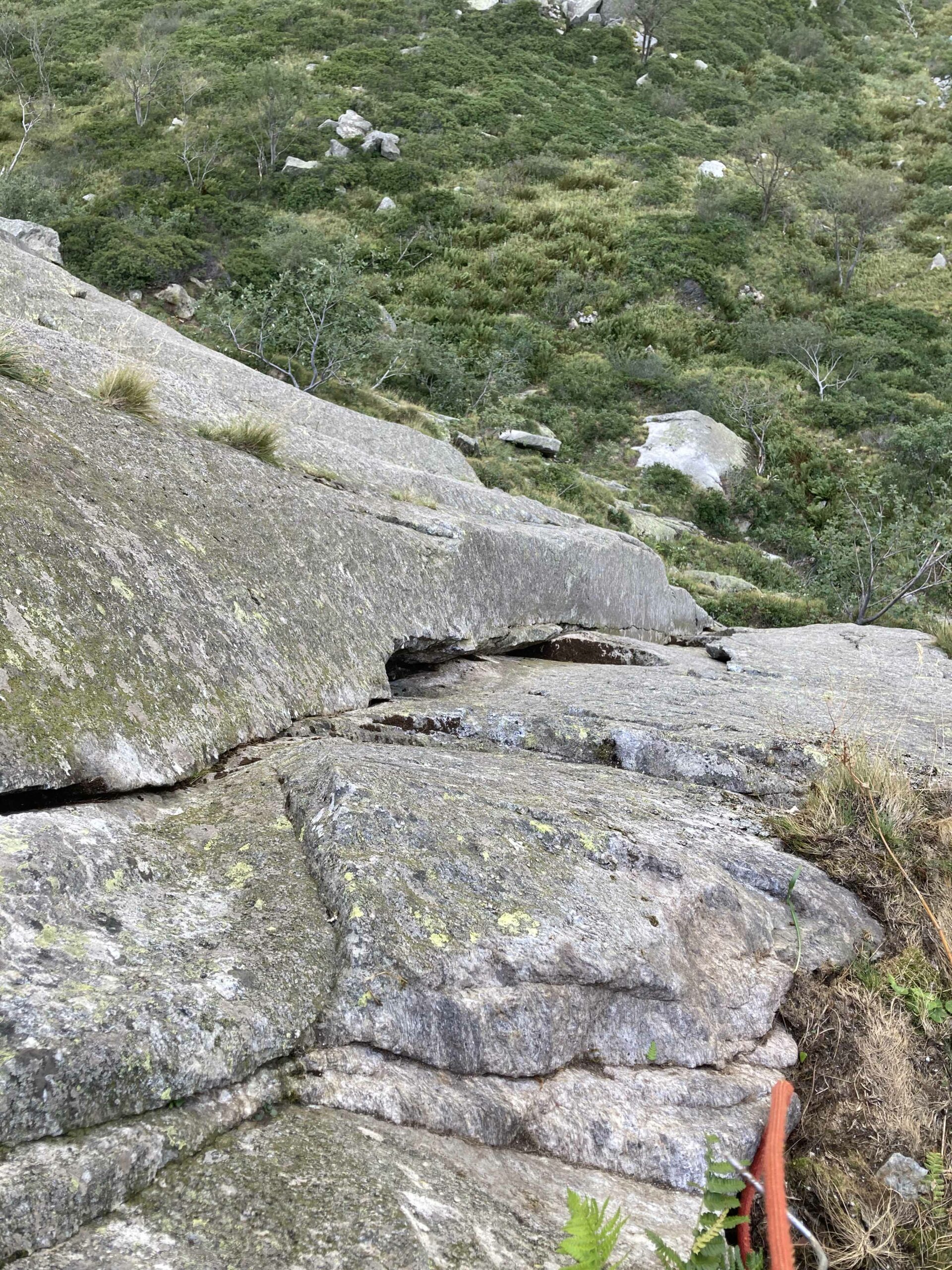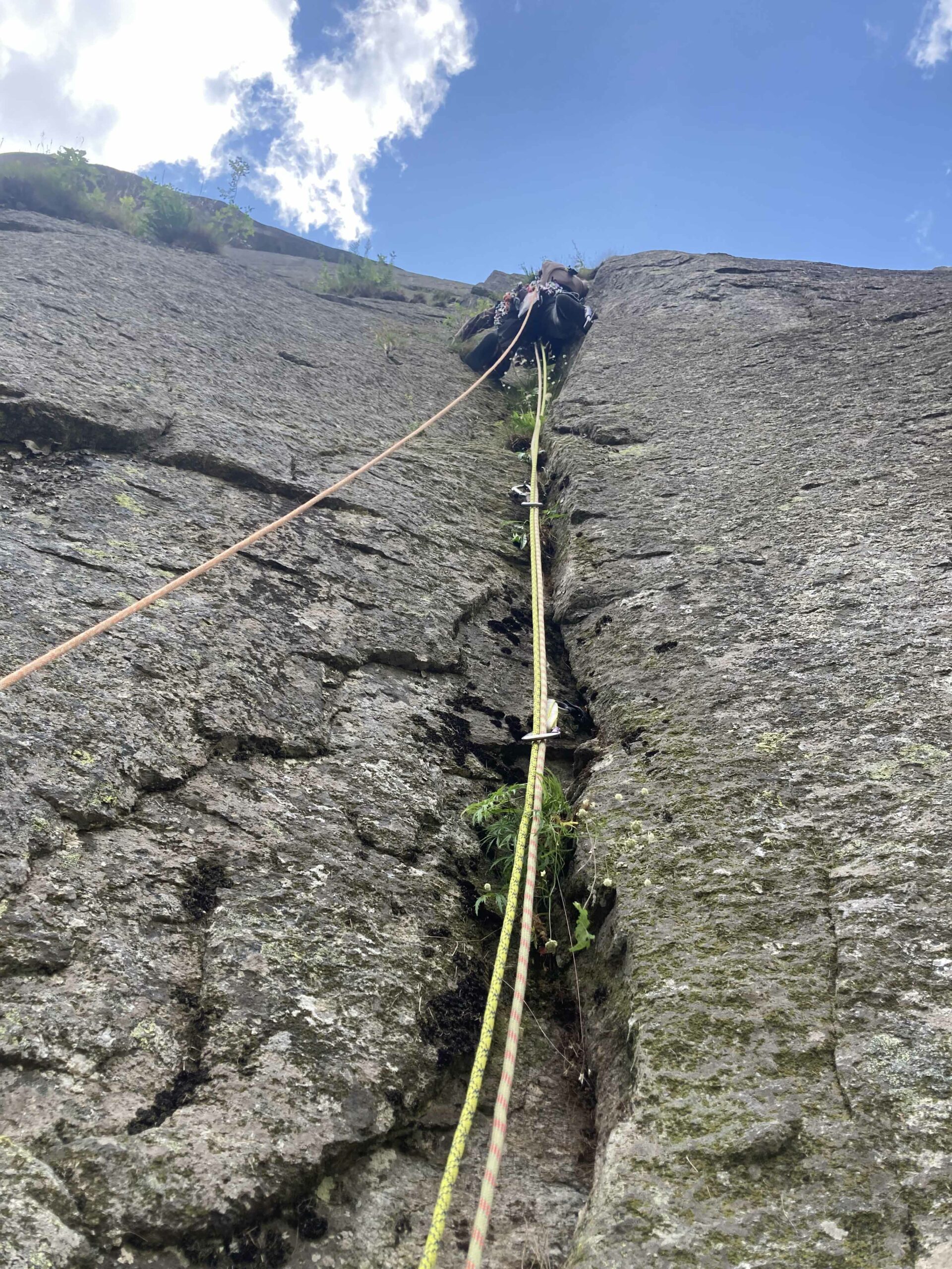- L2: Attaccare il diedro proteggendosi con friend piccoli e medi, utili anche i nut. Nella parte superiore, quando sembra farsi più difficile, appaiono generosi appoggi per i piedi. Piegare quindi a sinistra in direzioni di una sosta con spit fix collegati, di cui quello inferiore con anello di calata saldato. 6A 25mt