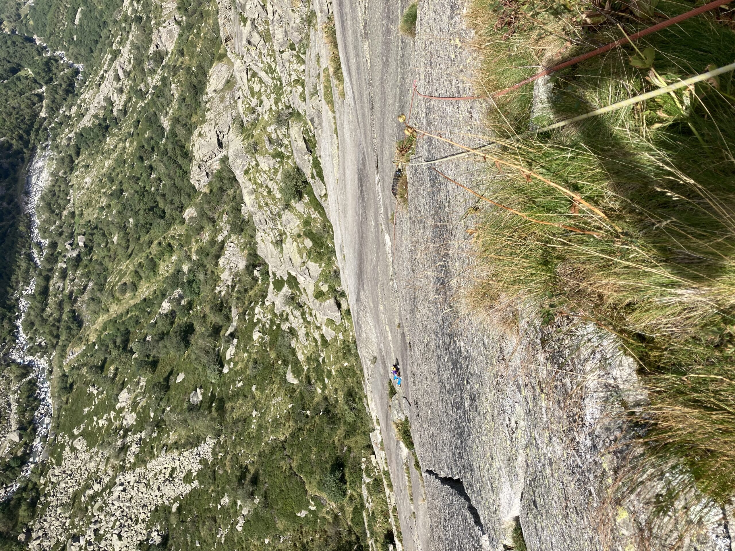 E’ possibile scalare la via anche con una singola da 60mt, ma bisogna portarsi un cordino o una mezza corda lunga altrettanto da utilizzare per le calate ed eventualmente recuperare uno zainetto.