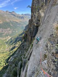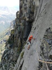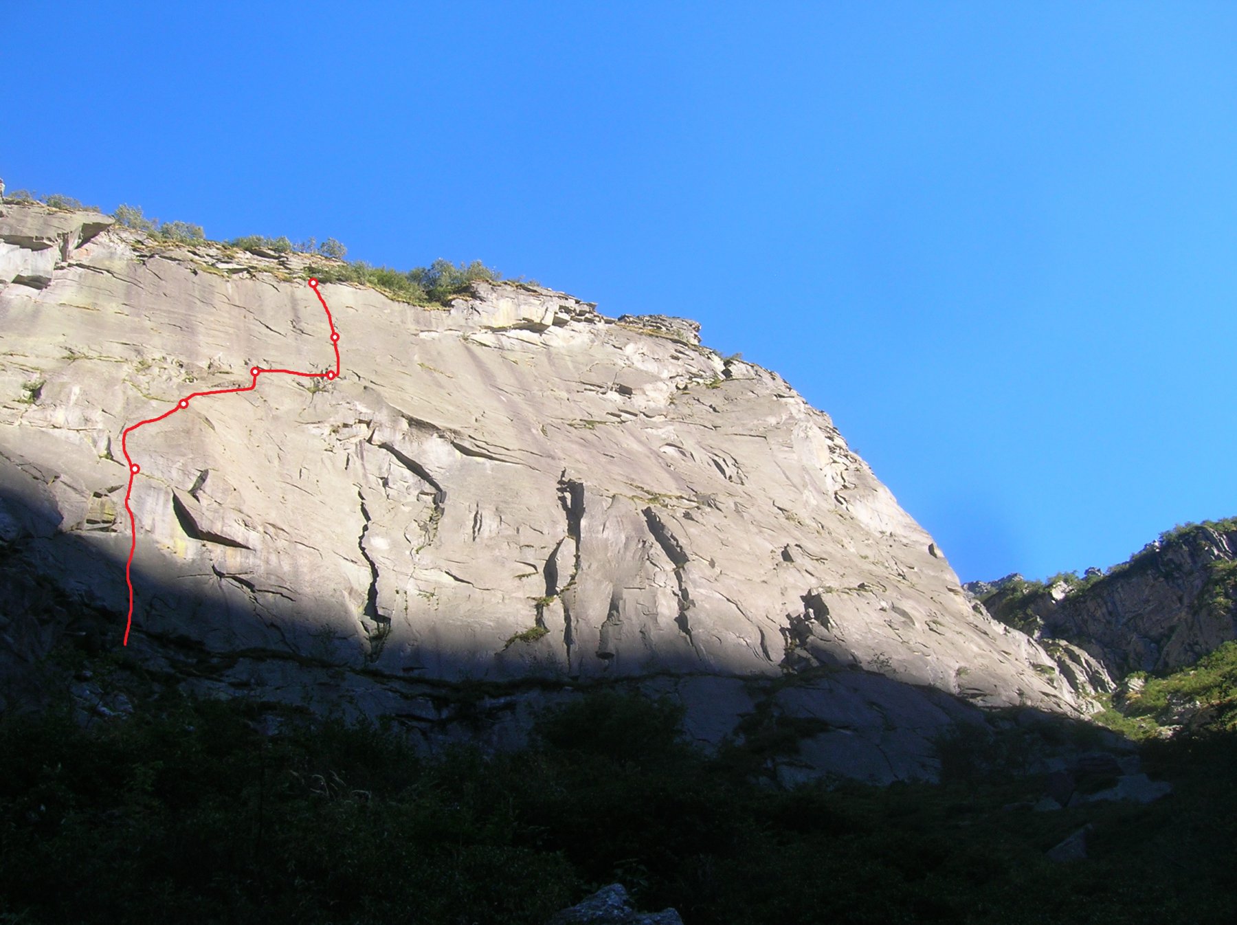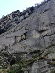 4° tiro) Tiro parzialmente nuovo. L’originale saliva per poi, con un pendolo, superare la placca. La nuova versione permette invece di superare scalando tutta la placca. 6B+, passo di 6C.