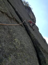 1° tiro) Tiro per metà nuovo. Dopo il fix superare la bella e inedita fessura di mano portandosi alla base della sovrastante placca, novità del restyling. Superarla e proseguire quindi per la fessura originale. 6B.