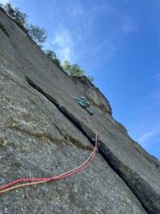 2° tiro) Alzarsi sopra la lama camino e superare quindi la bella fessurina fino a una cornice, stare bassi e ribaltarsi sopra. 6B/6B+