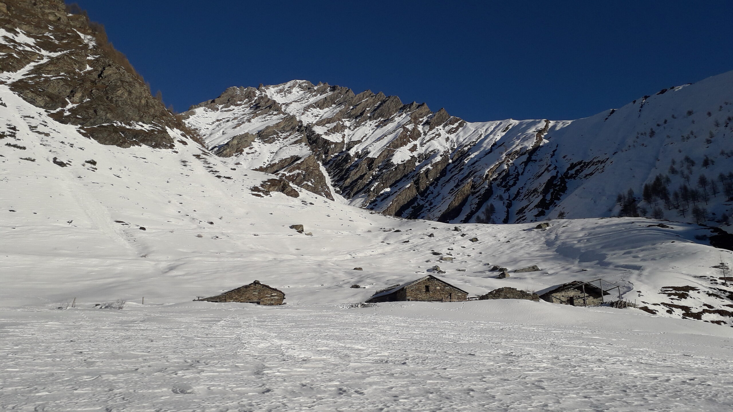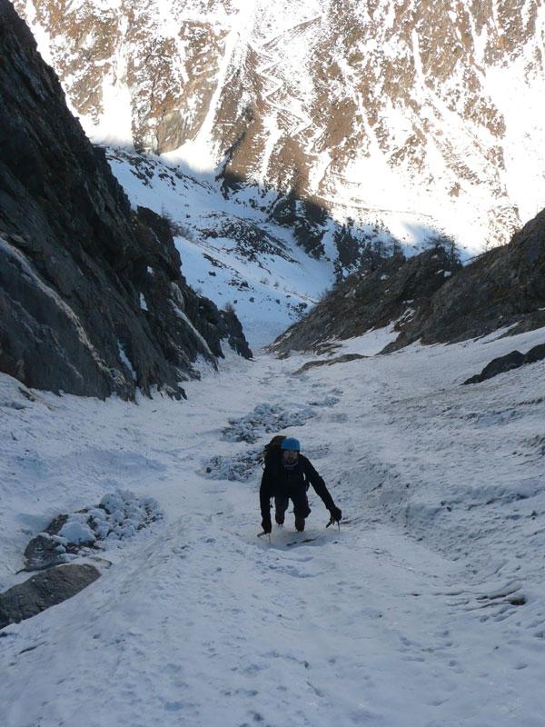 Salita: da Villanova salire all’alpe Crosenna, quindi seguire il sentiero balcone per il Rif. Jervis. Dopo un breve discesa si raggiunge il rio Crosenna, si abbandona il sentiero e si inizia a risalire il vallone su neve di valanga, fino a 1800 m circa quando sulla sx si apre il canale rettilineo visibile fino all’uscita in cresta. Si risale il canalone con picca e ramponi.
