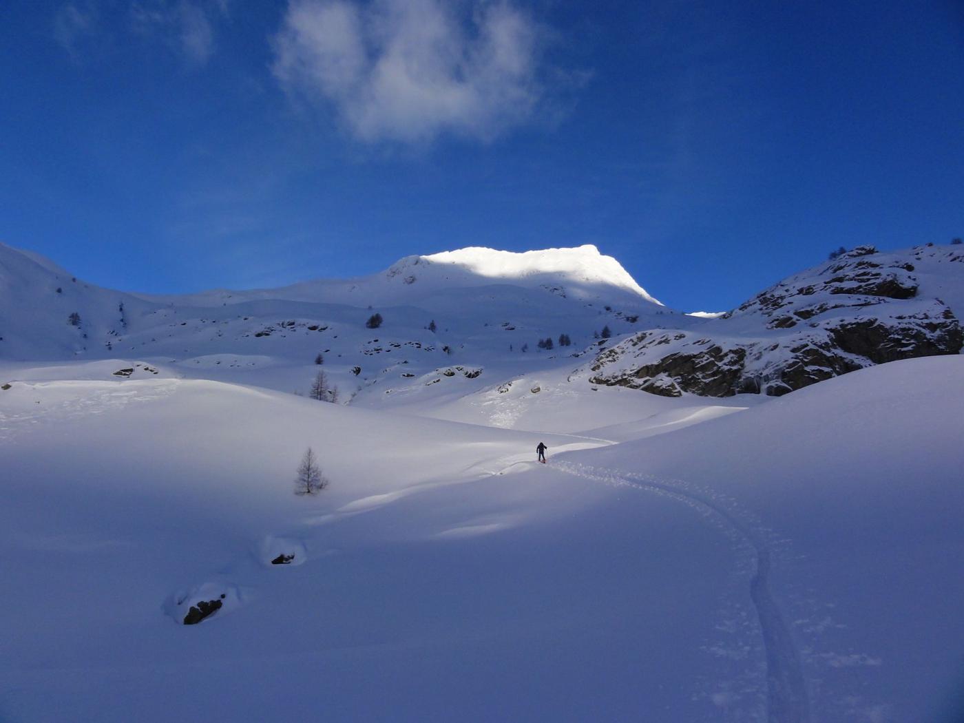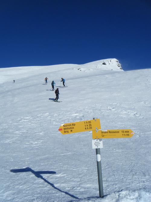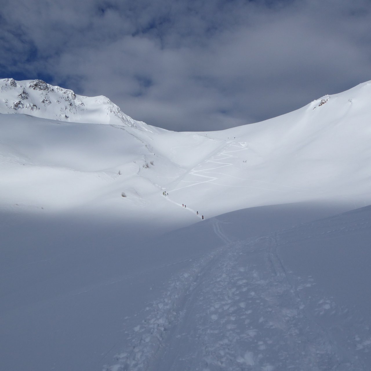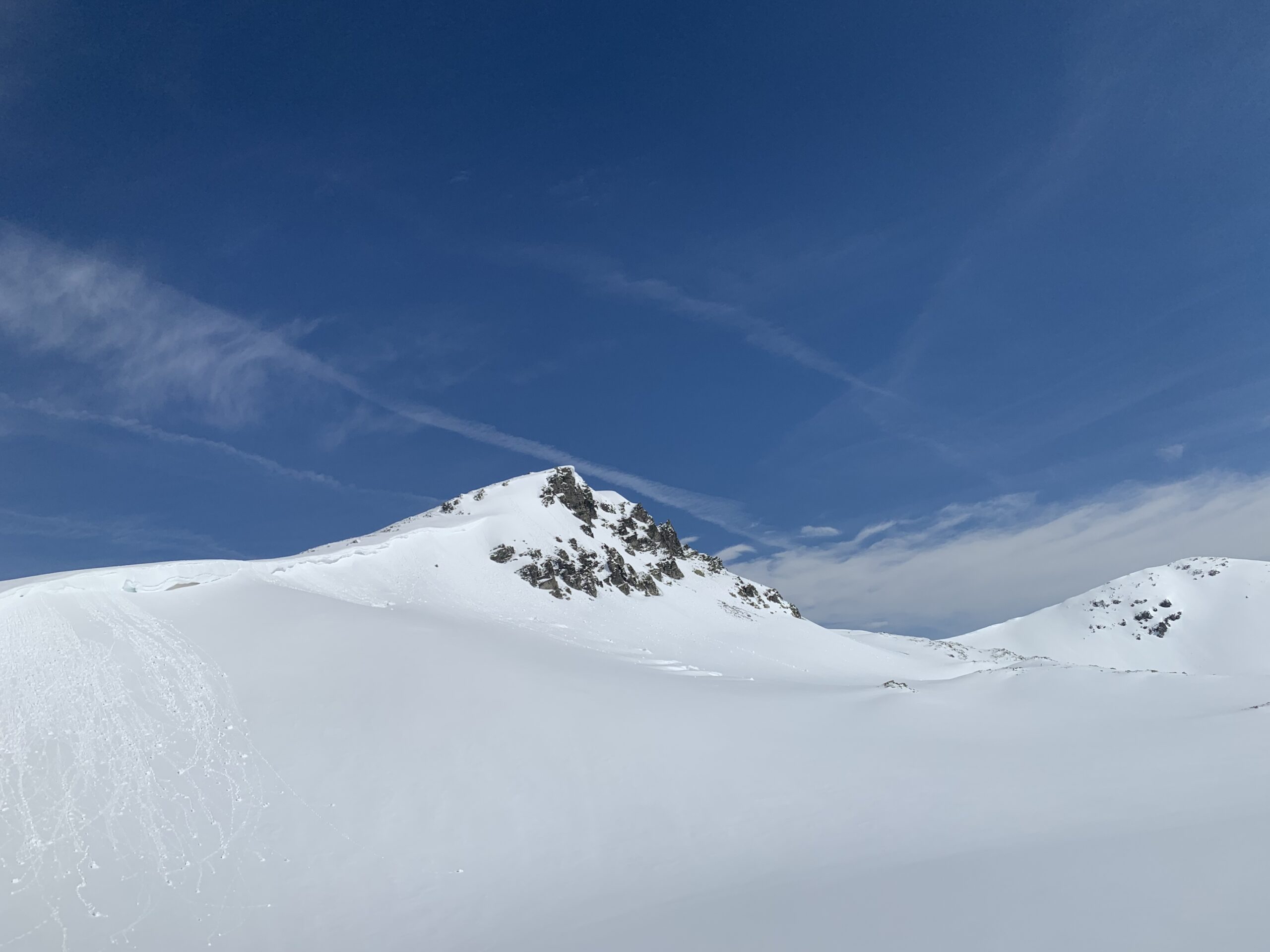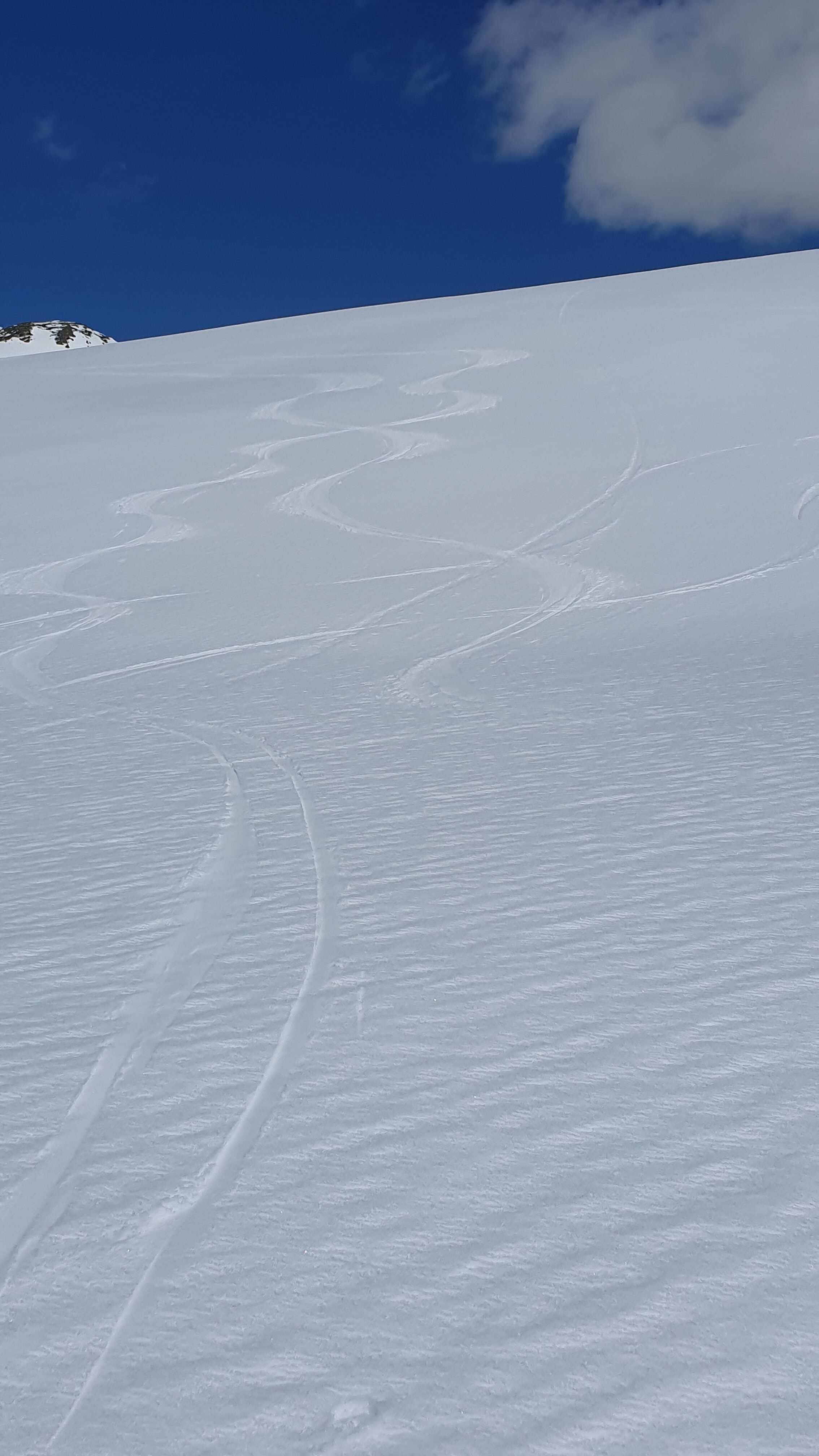 Eventuale salita anche al Touchuhorn m. 2661. Dallo Spitzhorli scendere fin sotto ai laghi Obre Rossusee, a ca. q. 2350 m., rimettere le pelli e risalire la cresta W del Tochuhorn, solitamente percorribile interamente sci ai piedi fino in vetta. Da questa vetta, oltre all’itinerario di salita, se vi sono buone condizioni di sicurezza è anche possibile scendere direttamente dal ripido versante SW (ingresso sui 45°, poi vi sono un paio di bei canali intorno ai 40°, AD/S4); al termine di questa ripida discesa, traversare verso uno dei percorsi iniziali di salita fatti per lo Spitzhorli.