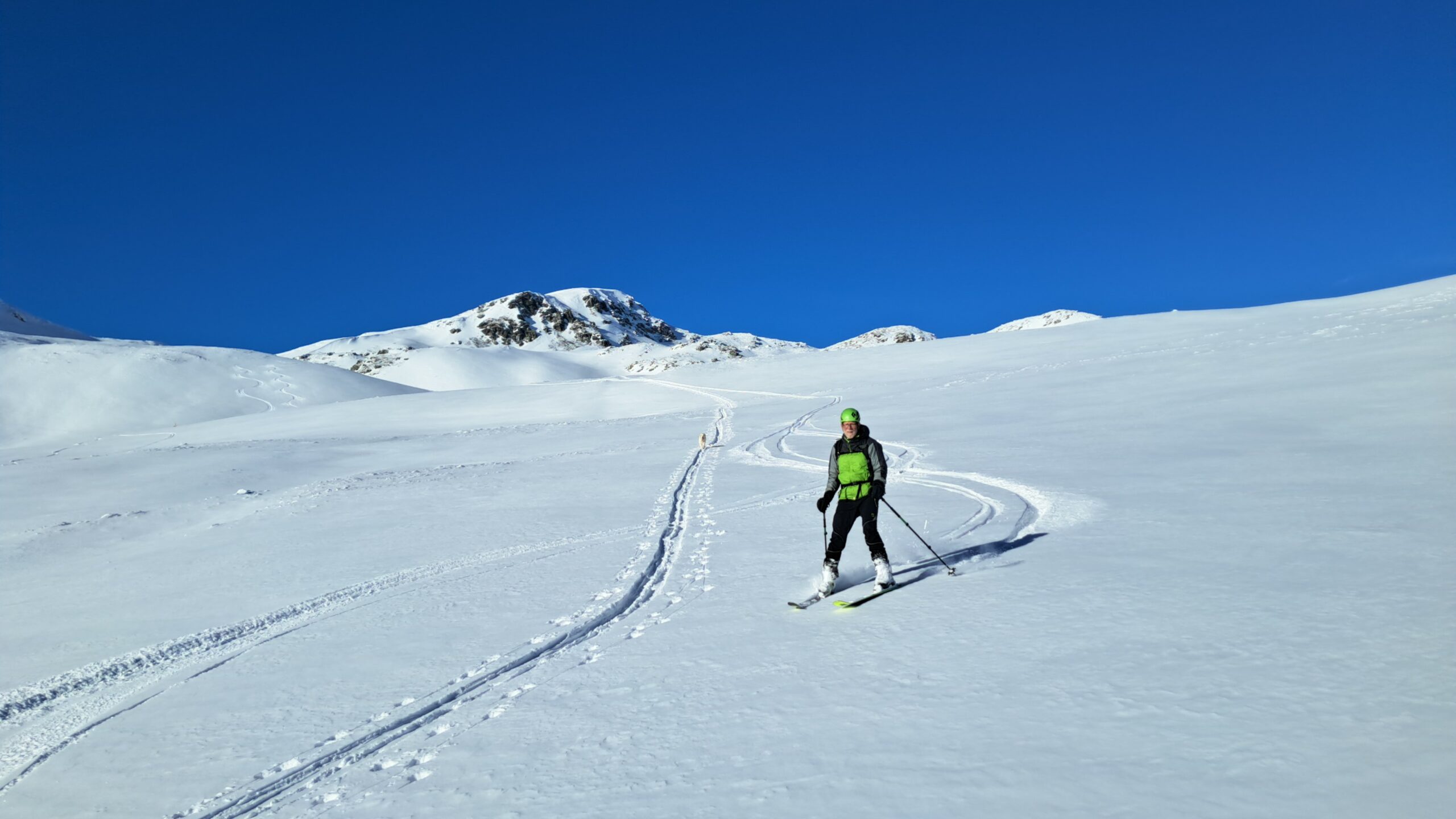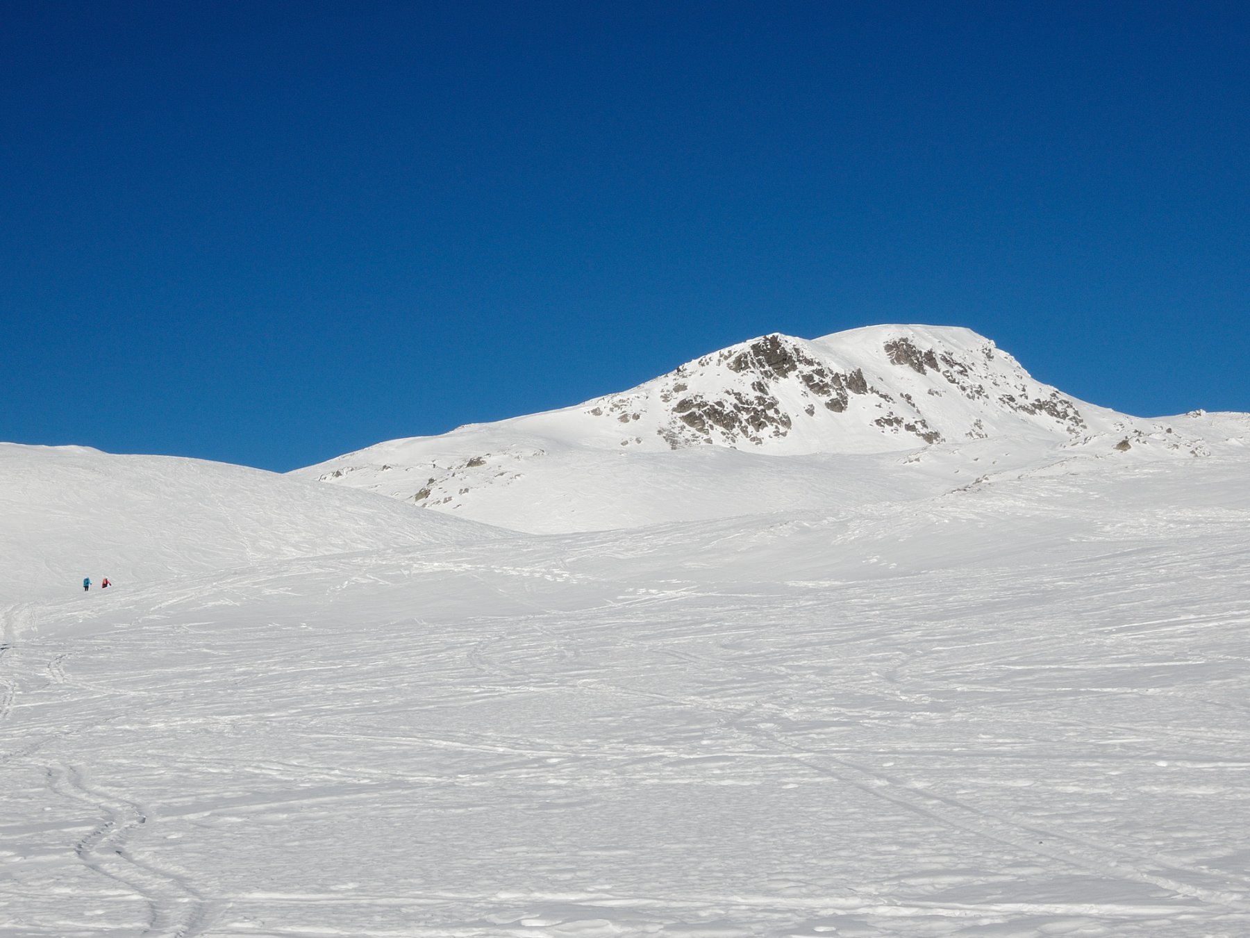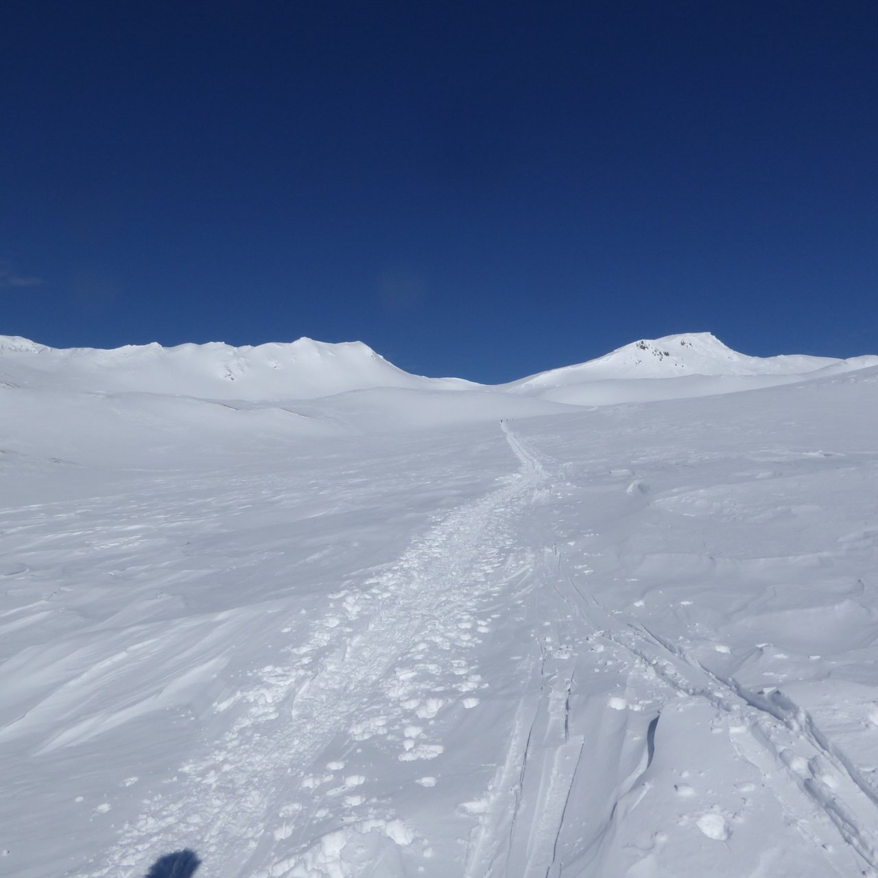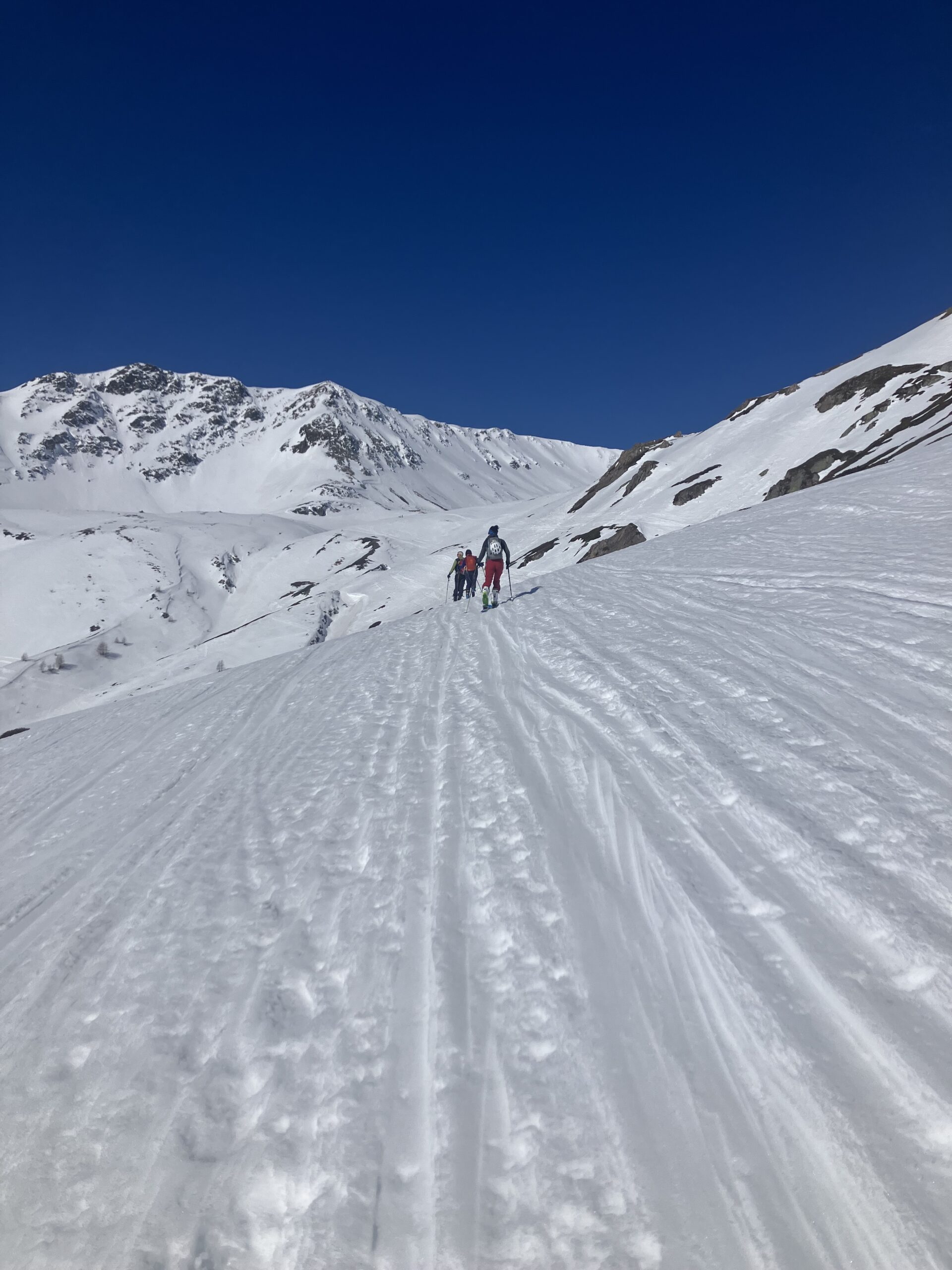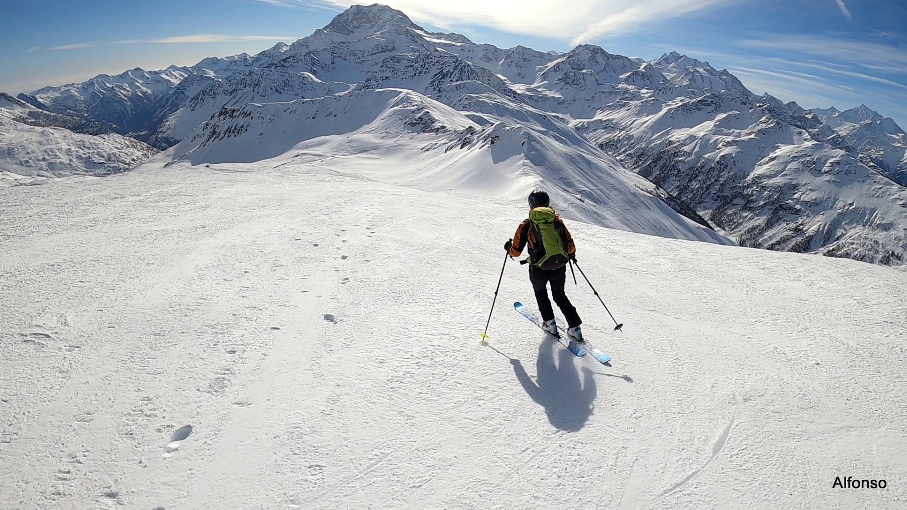 Eventuale salita anche al Touchuhorn m. 2661. Dallo Spitzhorli scendere fin sotto ai laghi Obre Rossusee, a ca. q. 2350 m., rimettere le pelli e risalire la cresta W del Tochuhorn, solitamente percorribile interamente sci ai piedi fino in vetta. Da questa vetta, oltre all’itinerario di salita, se vi sono buone condizioni di sicurezza è anche possibile scendere direttamente dal ripido versante SW (ingresso sui 45°, poi vi sono un paio di bei canali intorno ai 40°, AD/S4); al termine di questa ripida discesa, traversare verso uno dei percorsi iniziali di salita fatti per lo Spitzhorli.