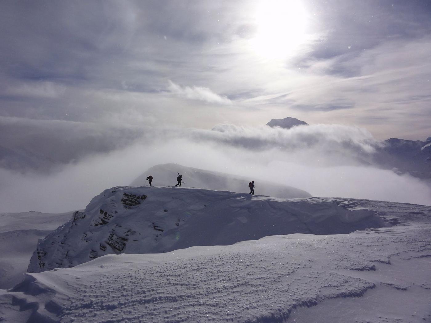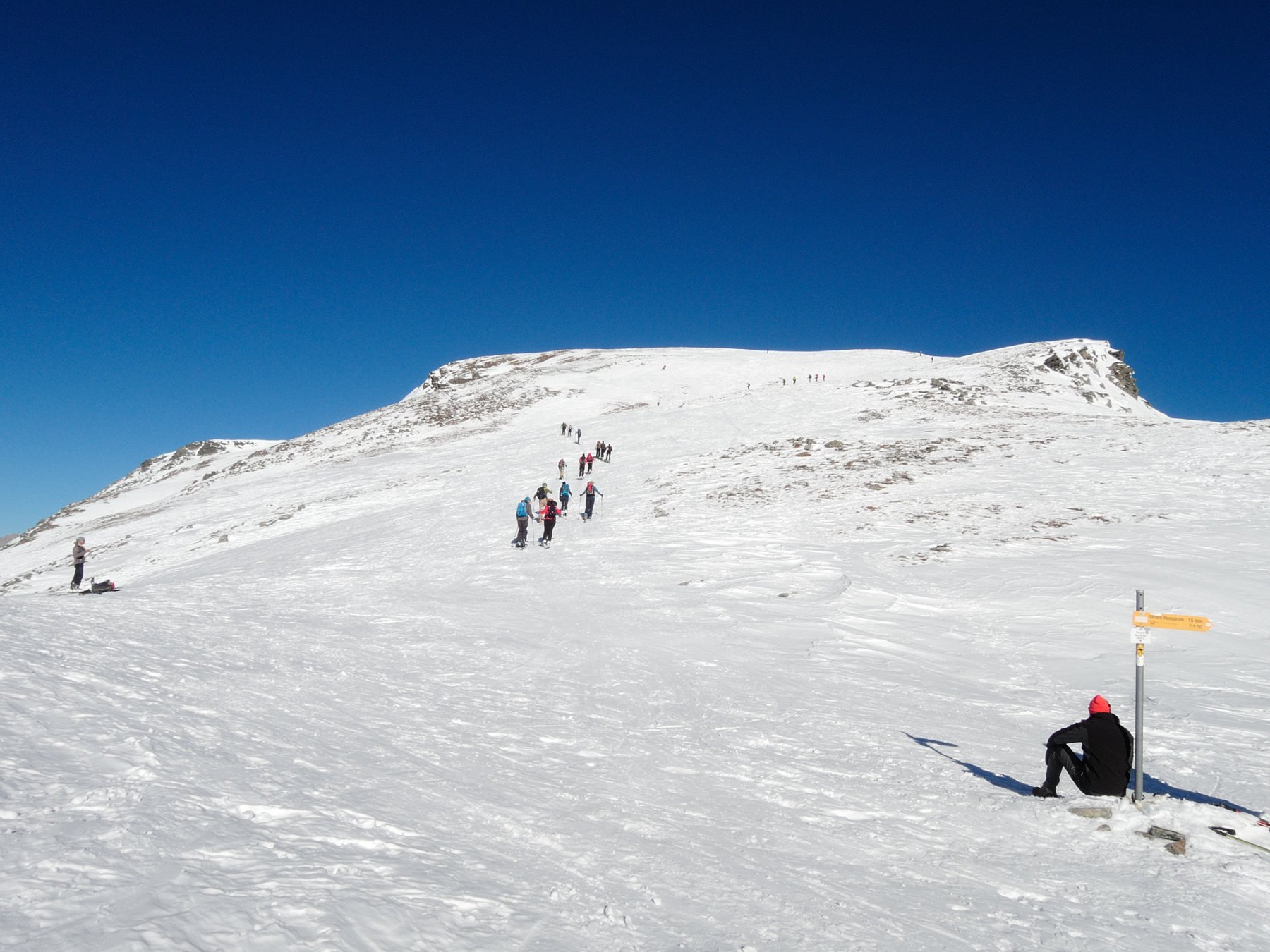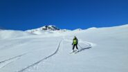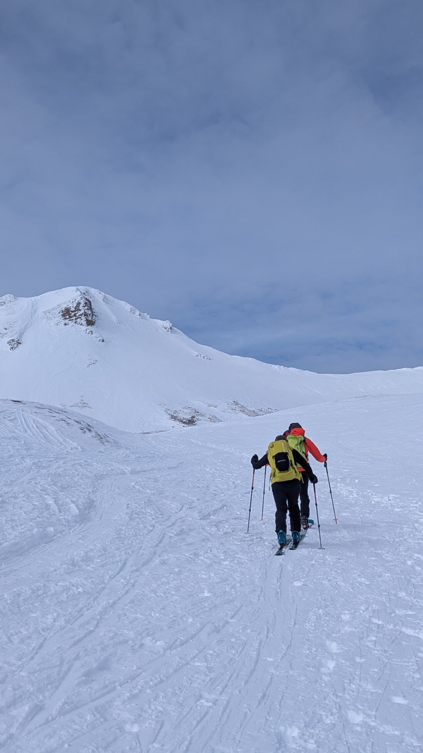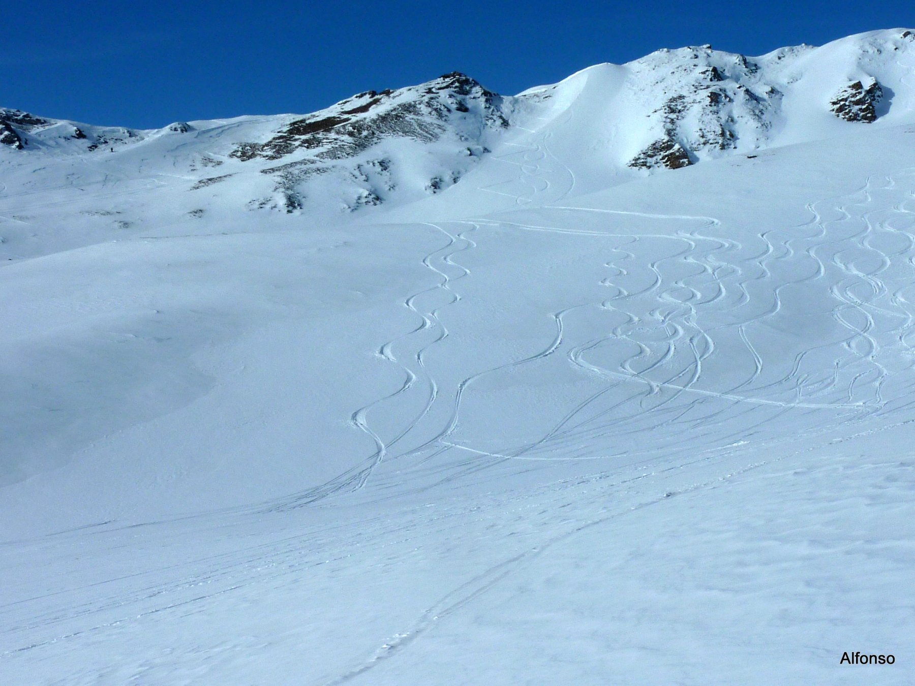 Eventuale salita anche al Touchuhorn m. 2661. Dallo Spitzhorli scendere fin sotto ai laghi Obre Rossusee, a ca. q. 2350 m., rimettere le pelli e risalire la cresta W del Tochuhorn, solitamente percorribile interamente sci ai piedi fino in vetta. Da questa vetta, oltre all’itinerario di salita, se vi sono buone condizioni di sicurezza è anche possibile scendere direttamente dal ripido versante SW (ingresso sui 45°, poi vi sono un paio di bei canali intorno ai 40°, AD/S4); al termine di questa ripida discesa, traversare verso uno dei percorsi iniziali di salita fatti per lo Spitzhorli.