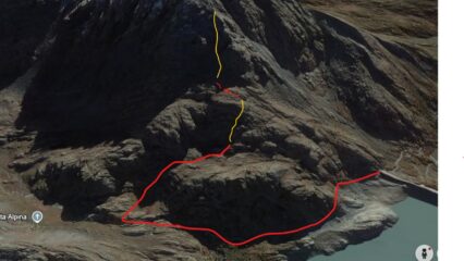 NB dalla cima dopo sosta 11 a pochi metri a sx ci sono delle fettucce già trovate in loco, su uno spuntone con anello, una doppia da 50 metri porta in un ripido canale detritico che scende direttamente nel vallone, è la discesa più rapida ma attenzione ai sassi nel canale stretto. giunti alla base del canale riprendere la discesa nel vallone in direzione val poschiavina come descritto sopra.