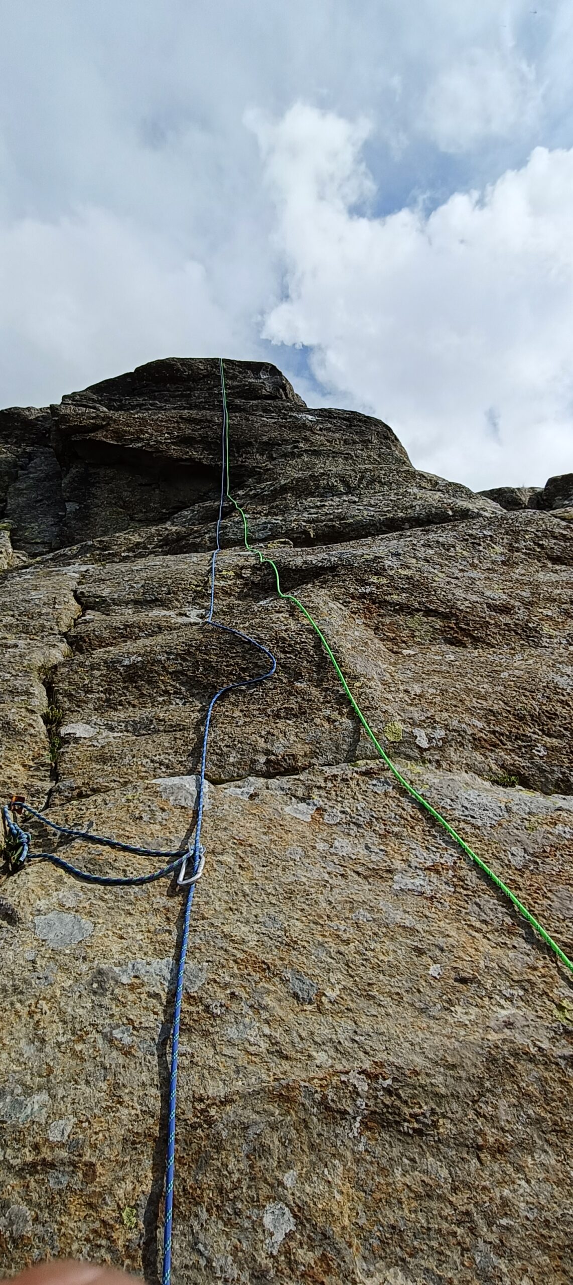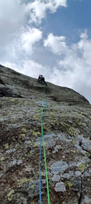 - L7 sosta da attrezzare o sicura in vita da larga cengia salire un muro ben proteggibile con cordini in spuntoni e clessidre per un evidente fessura fino alla (sosta 2 fix ) 30 mt. NB è possibile fare un tiro unico da L6 con corda da 60 mt
